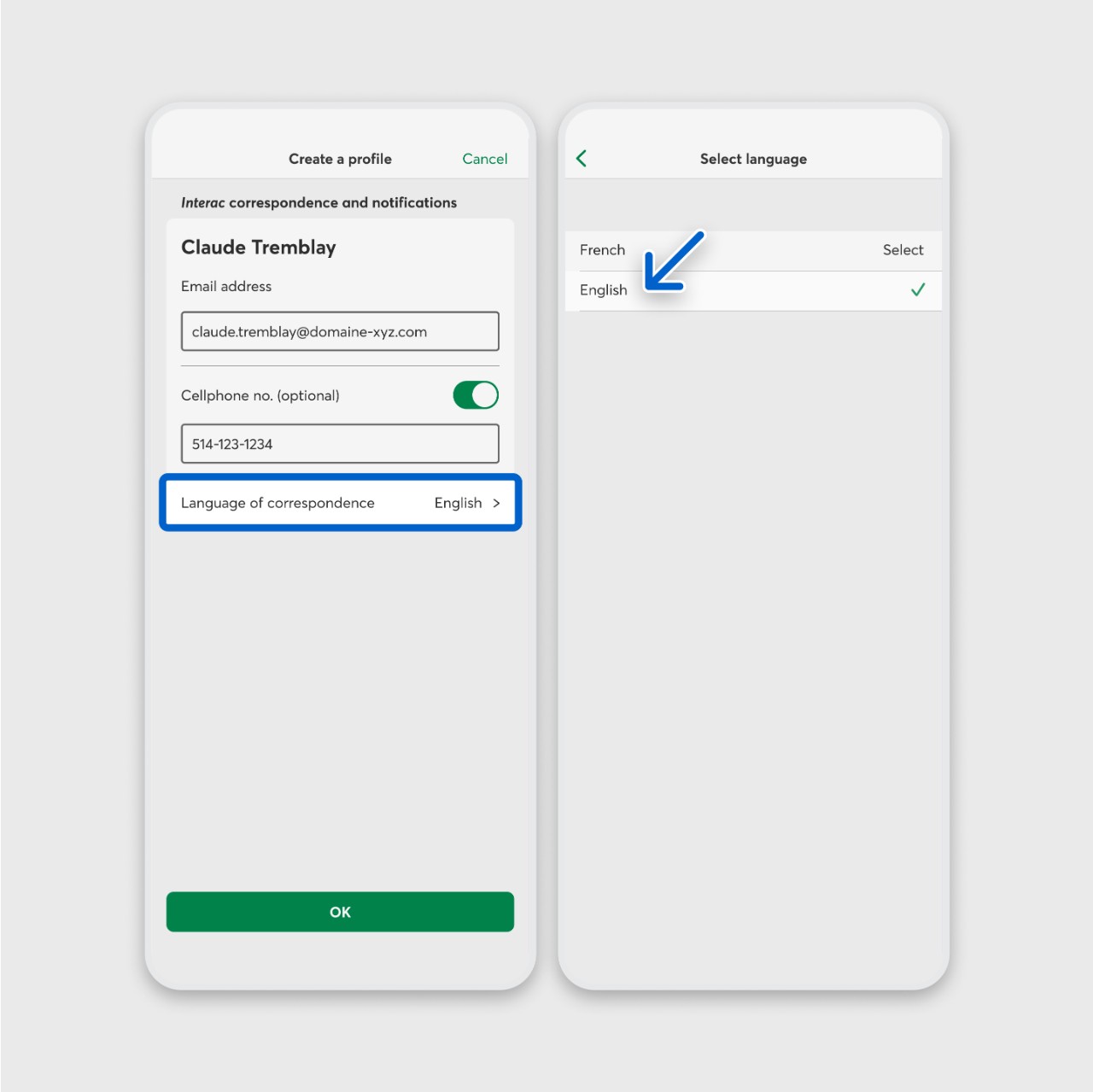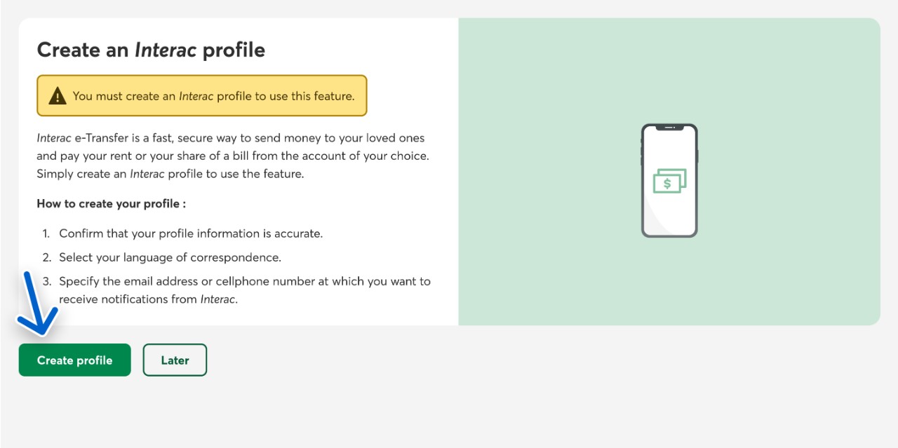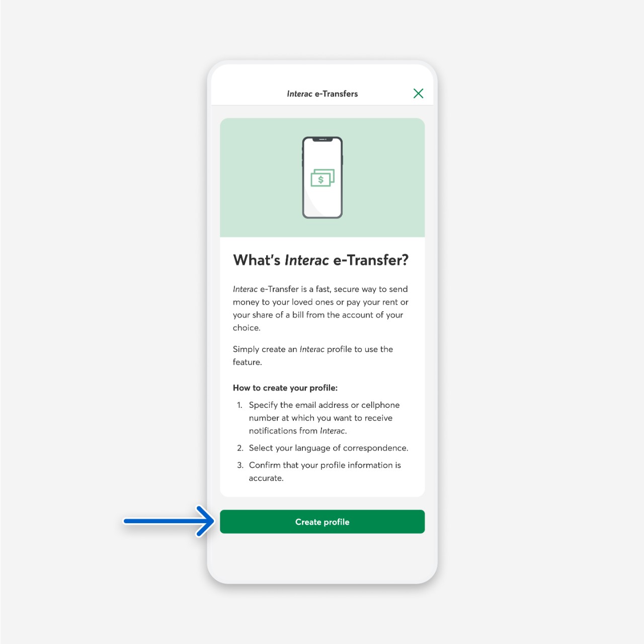 Create an Interac® profile on AccèsD from your mobile device or computer. You need to have a profile to send or receive money by Interac e-Transfer.