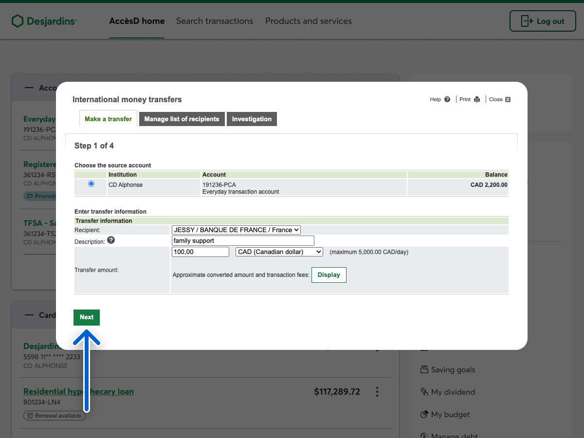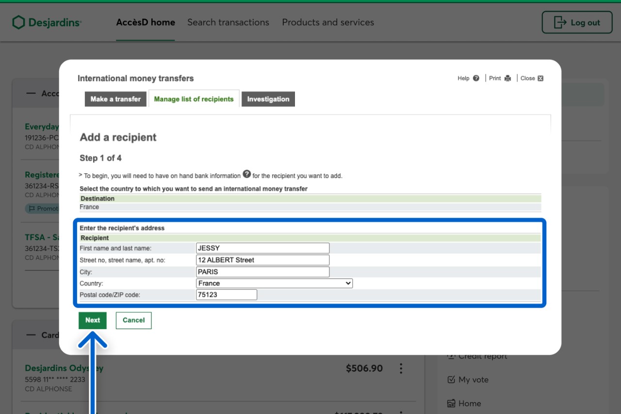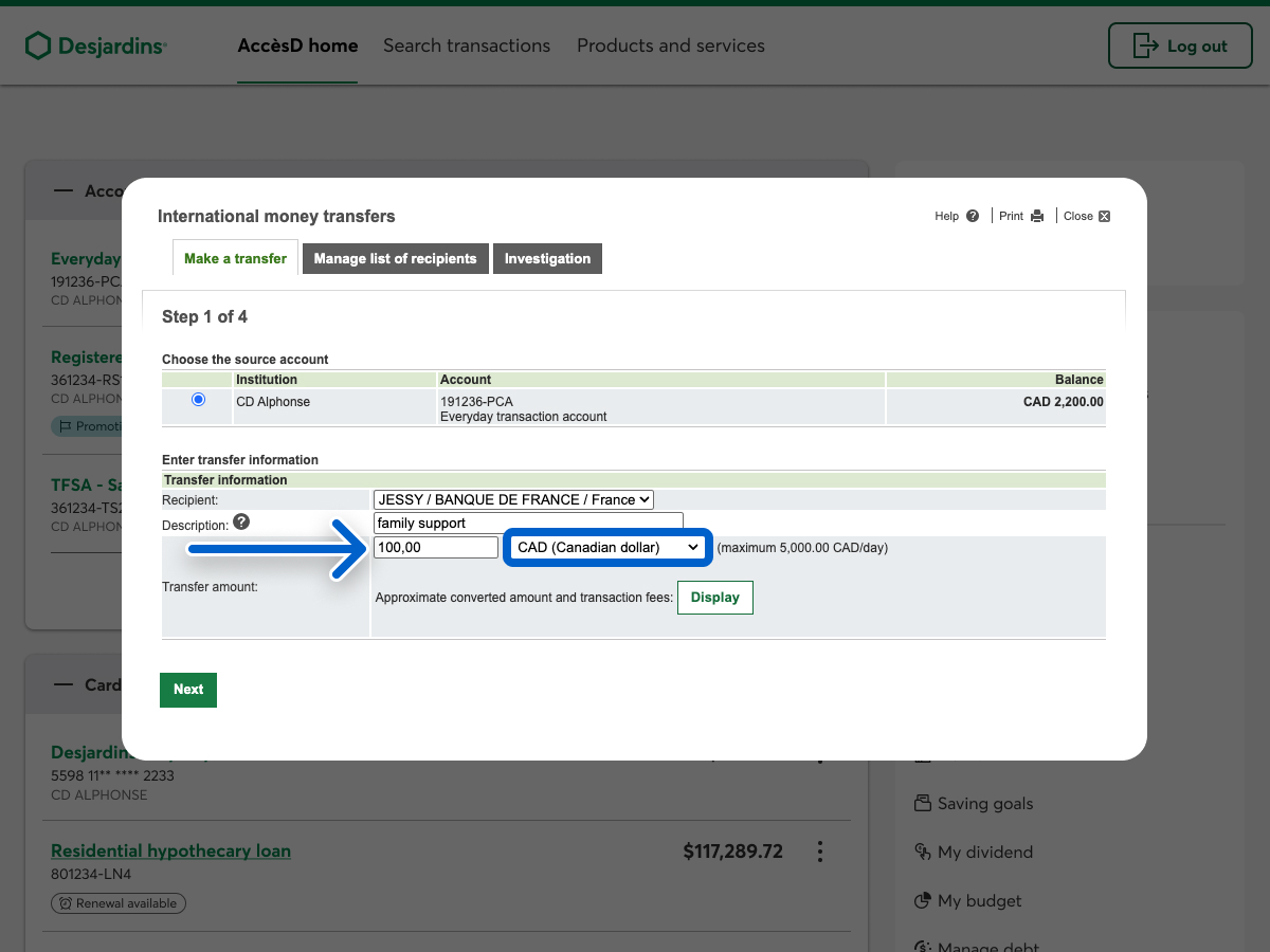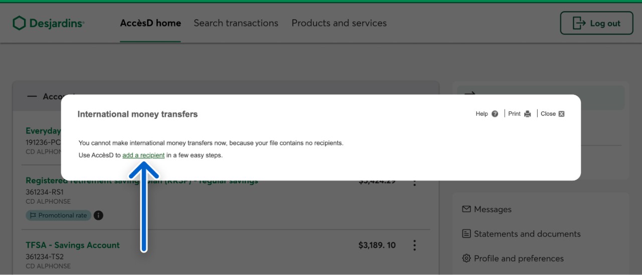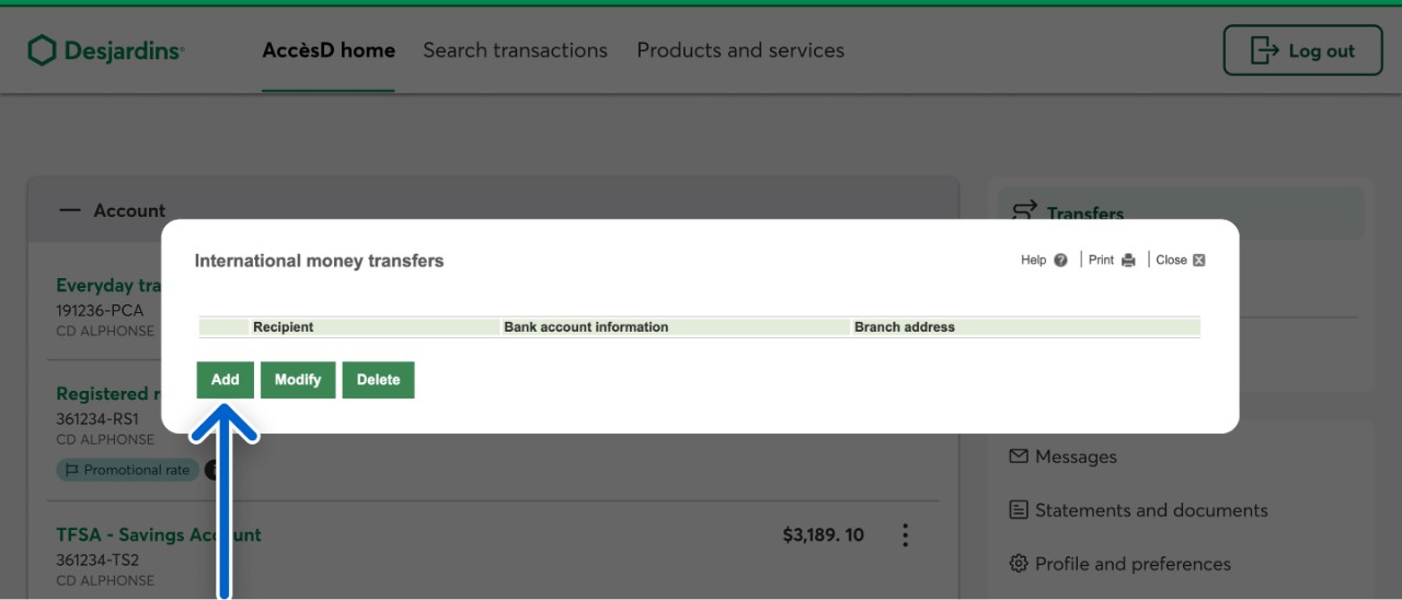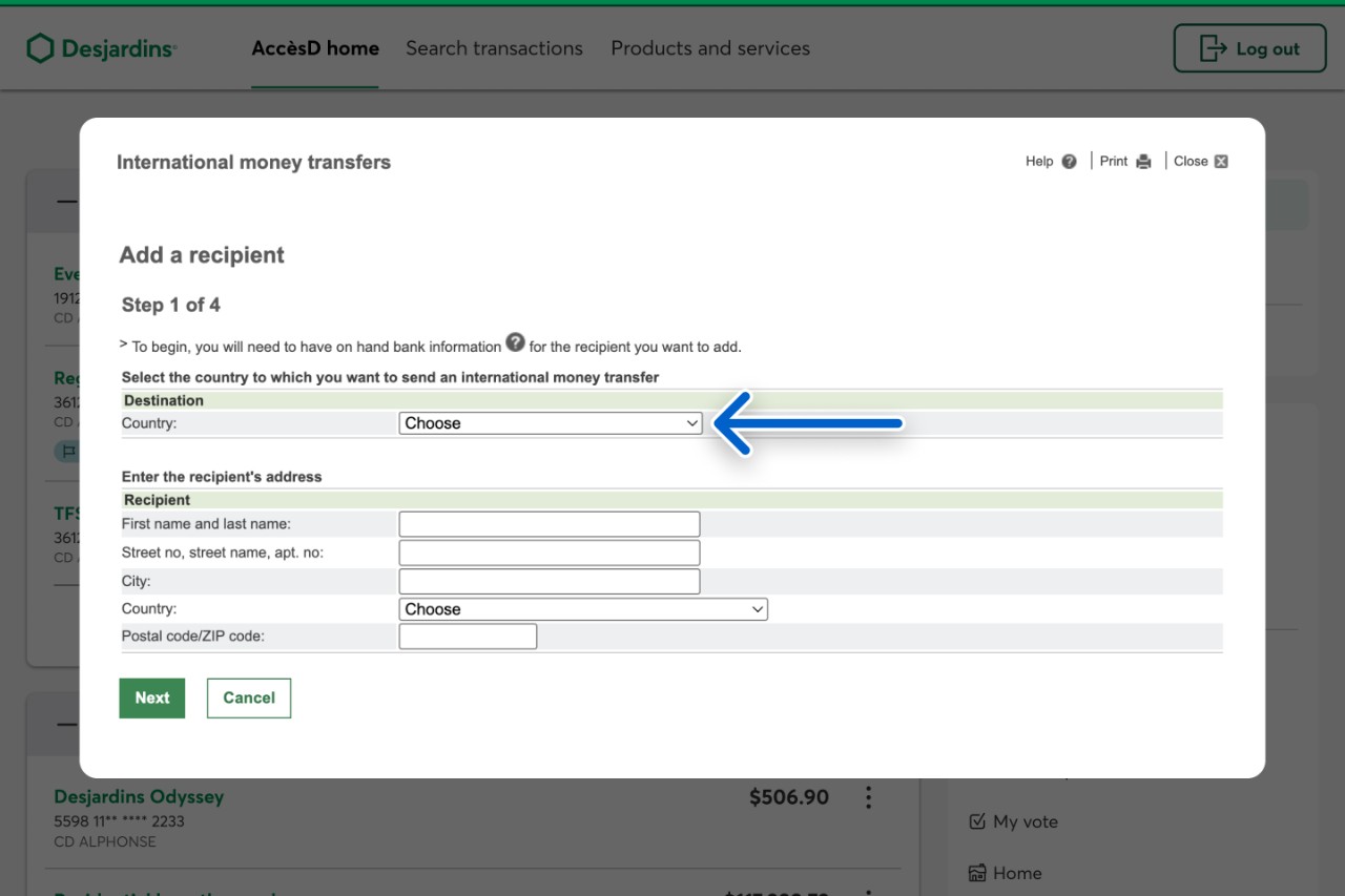 Learn how to send an international money transfer on AccèsD. This feature is not yet available in our mobile app.