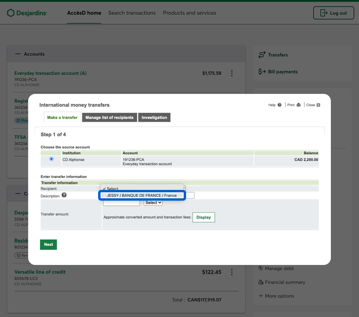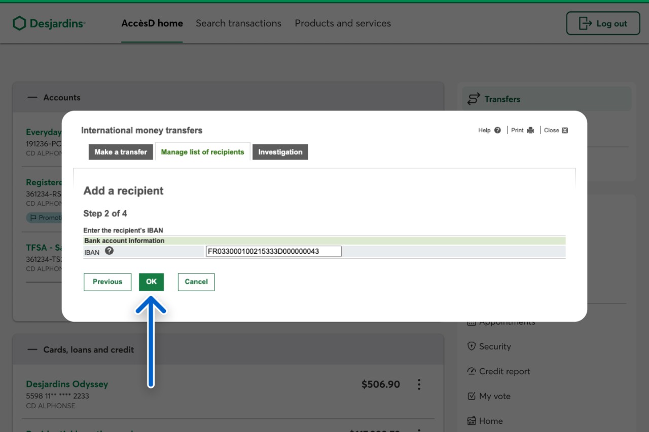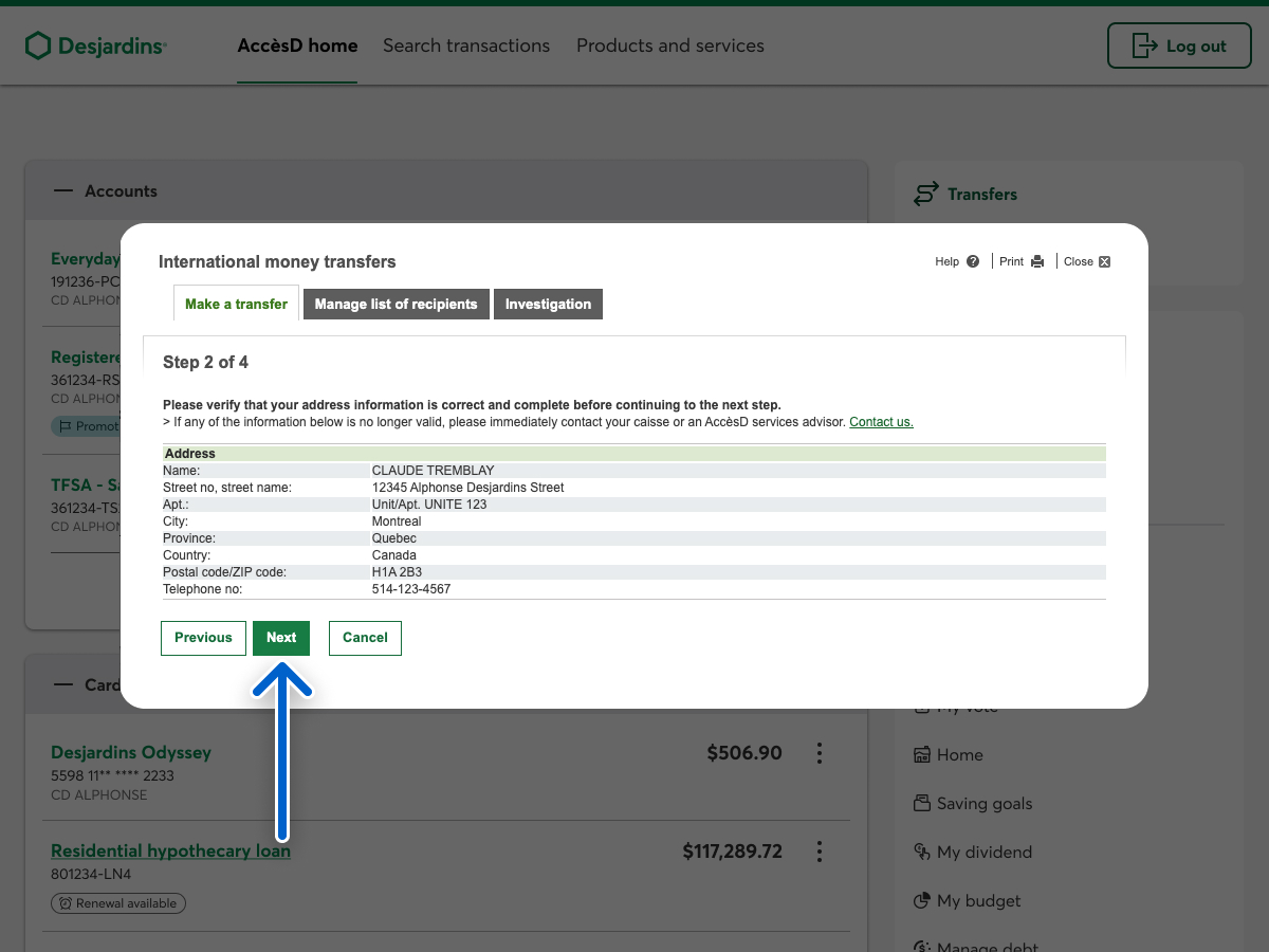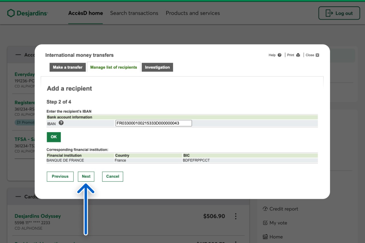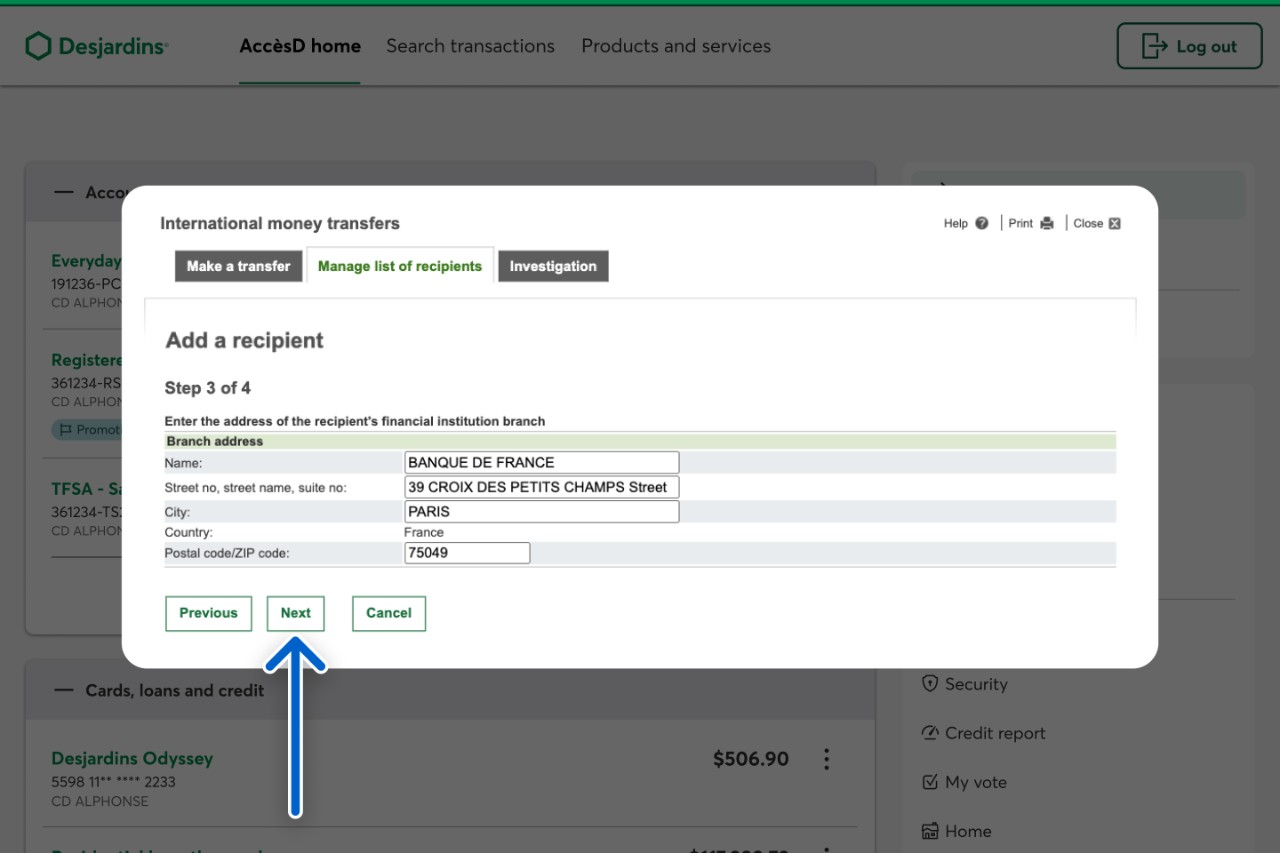 Learn how to send an international money transfer on AccèsD. This feature is not yet available in our mobile app.