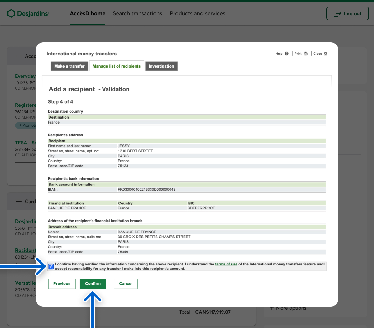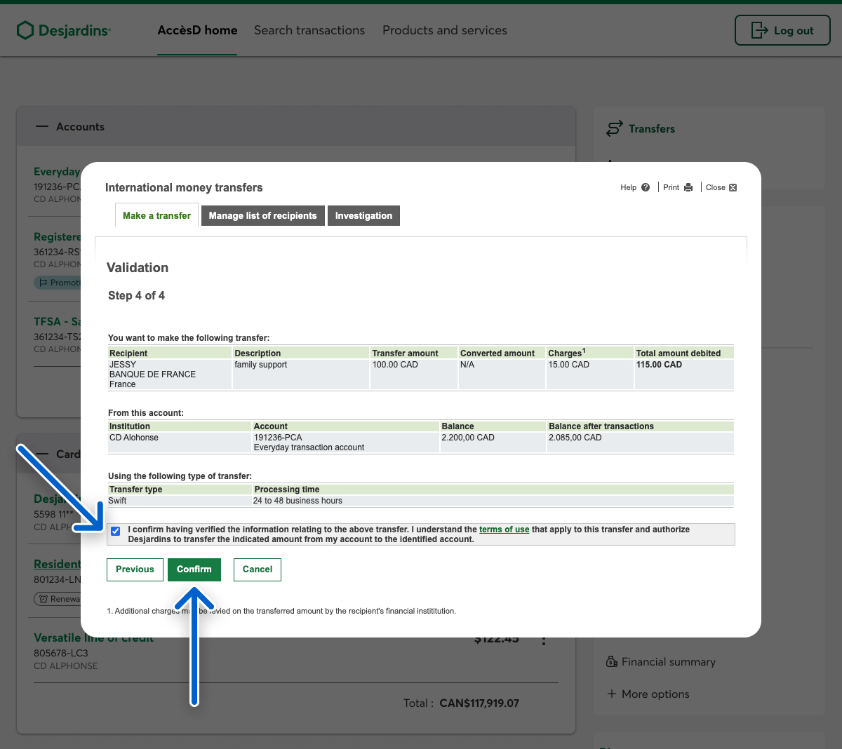 On the Validation page, double-check all the information for the transfer, select the box to accept the terms of use, then select the Confirm button to send your transfer.