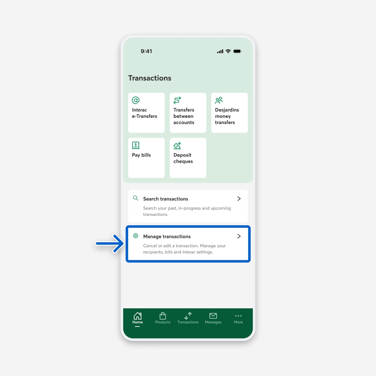 Log in to the Desjardins mobile services app, then select the Transactions tab.