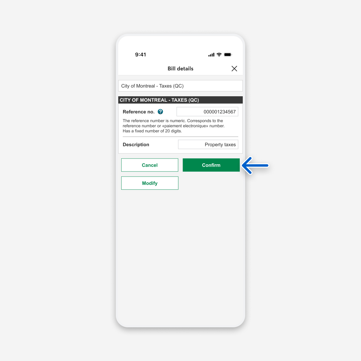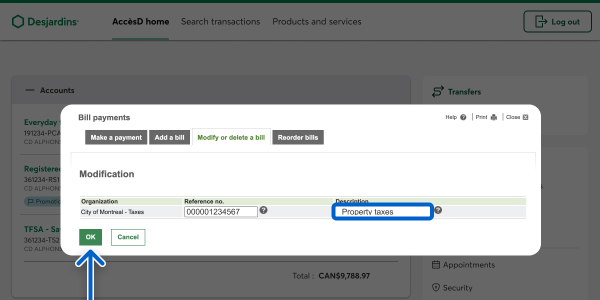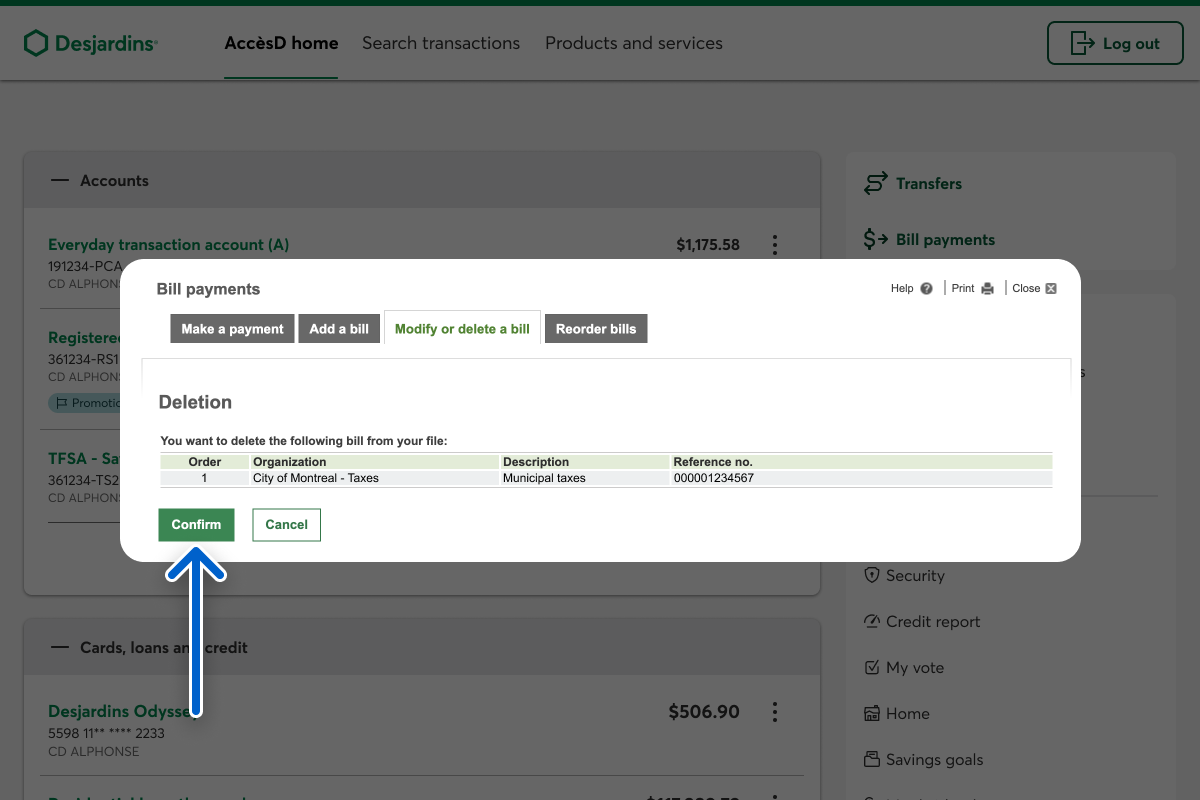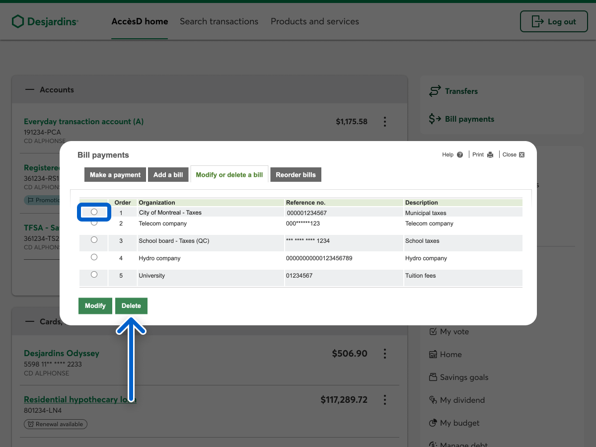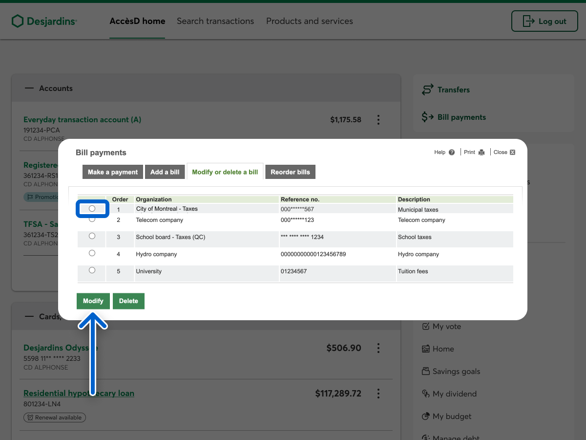 Log in to AccèsD. On the home page, select the Bill payments button.