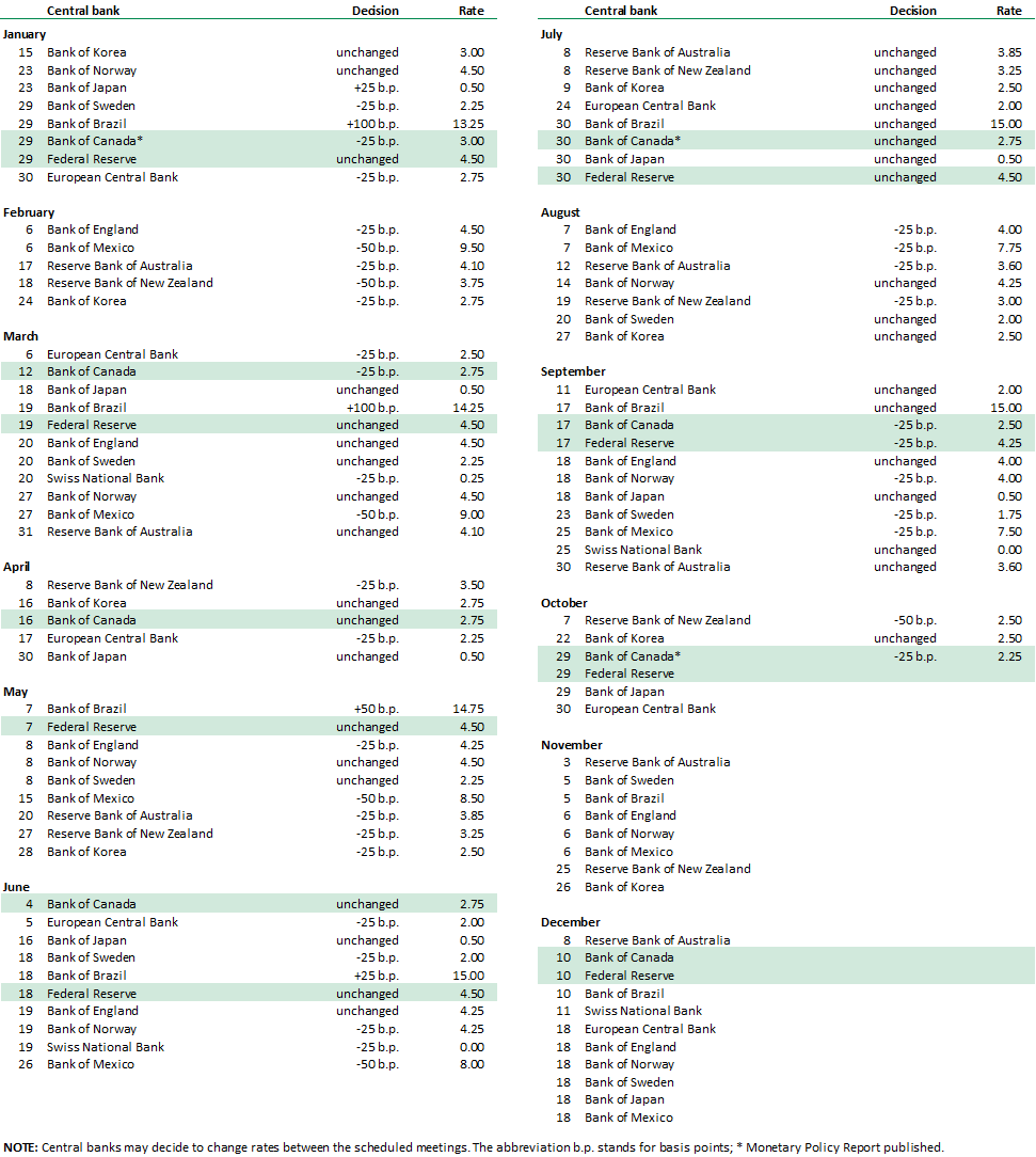 - The Bank of Canada cut its policy rate by 25 basis points for the second consecutive meeting to 2.25%, in line with the widely held view of economists and markets. The policy rate is now at the lower bound of the Bank’s estimated range for the neutral rate.