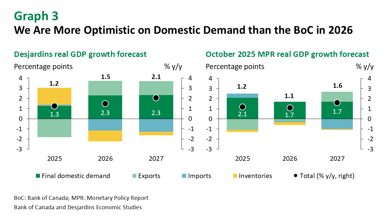 Our baseline outlook External link. for the Canadian economy is more positive than the Bank’s, despite the risks to the outlook remaining tilted to the downside due to the uncertainty of US trade policy (graph 3). First, our analysis External link. suggests that the removal of countertariffs on most previously dutied imports from the United States should boost growth in 2026 by about 0.2 percentage points (ppts). Second, by convention, the BoC has not yet accounted for the substantial expansion in federal fiscal spending that is expected to accompany next week’s 2025 budget (see our preview External link.). This is likely to provide a meaningful tailwind to economic growth starting in mid‑2026, to the tune of roughly 0.3 ppts next year, and should result in an upward revision to the Bank’s forecast in its January 2026 MPR. Notably, our forecast for inflation remains in line with the BoC’s 2% target.