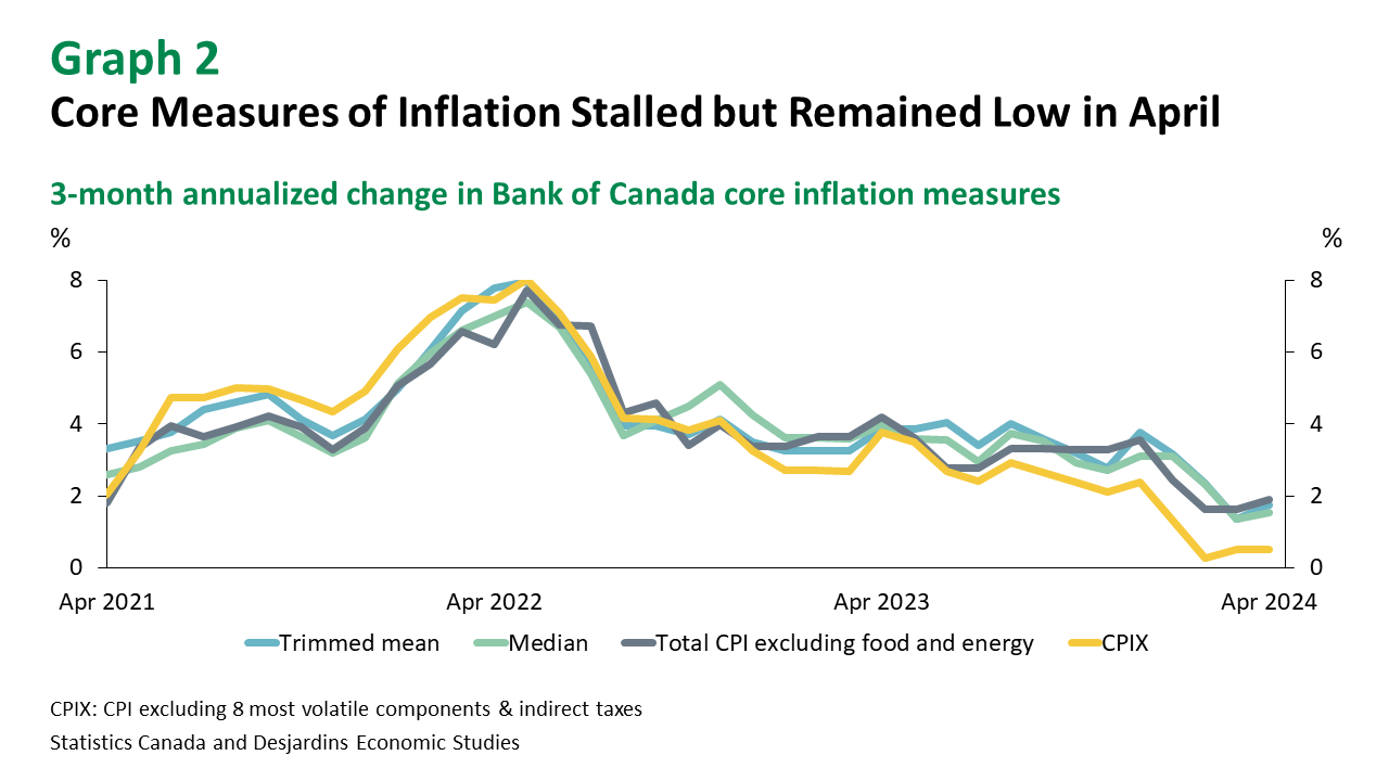 Turning to underlying inflation, the Bank of Canada’s preferred measures of core year-over-year price growth—CPI median and trimmed mean—decelerated again in April and are now both below 3%. But on a 3-month annualized basis, these measures reaccelerated on average by 0.2 percentage points to reach 1.5% and 1.8%, respectively (graph 2). Looking to the more universally referenced total CPI inflation excluding food and energy, inflation on a 3-month annualized basis rose three ticks to 1.9% in April. Finally, growth in the Bank’s former preferred measure of core inflation—CPIX (CPI excluding the 8 most volatile components & indirect taxes)—was unchanged at 0.5% when calculated the same way, under 2% for the fourth consecutive month. While this reprieve in the near-term disinflationary momentum seen recently may raise eyebrows, the fact that these measures were below the Bank’s 2% target remains a positive sign that price growth is headed in the right direction.