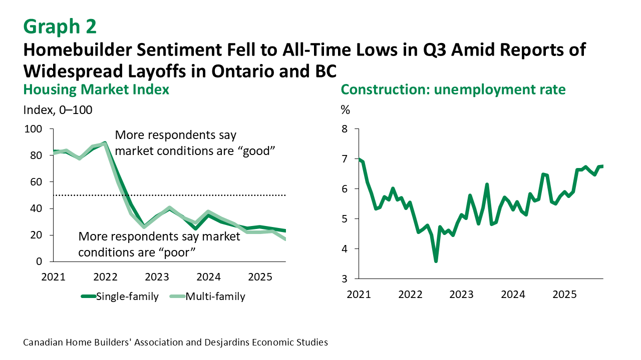 Despite robust housing starts in 2025 overall, homebuilder sentiment in Q3 plunged to record lows in both the single- and multi-unit sectors (graph 2). Declining confidence stemmed from ongoing trade uncertainty and hesitation among would-be first-time homebuyers waiting for the promised GST rebate to pass into law. Additionally, inflation in construction materials since 2020 has added an estimated $99,000 to the cost of building a 2,400-square-foot home. Mounting unemployment in the construction sector raises concerns about fewer projects breaking ground, reinforced by reports of unprecedented weakness in condo presales across key markets.