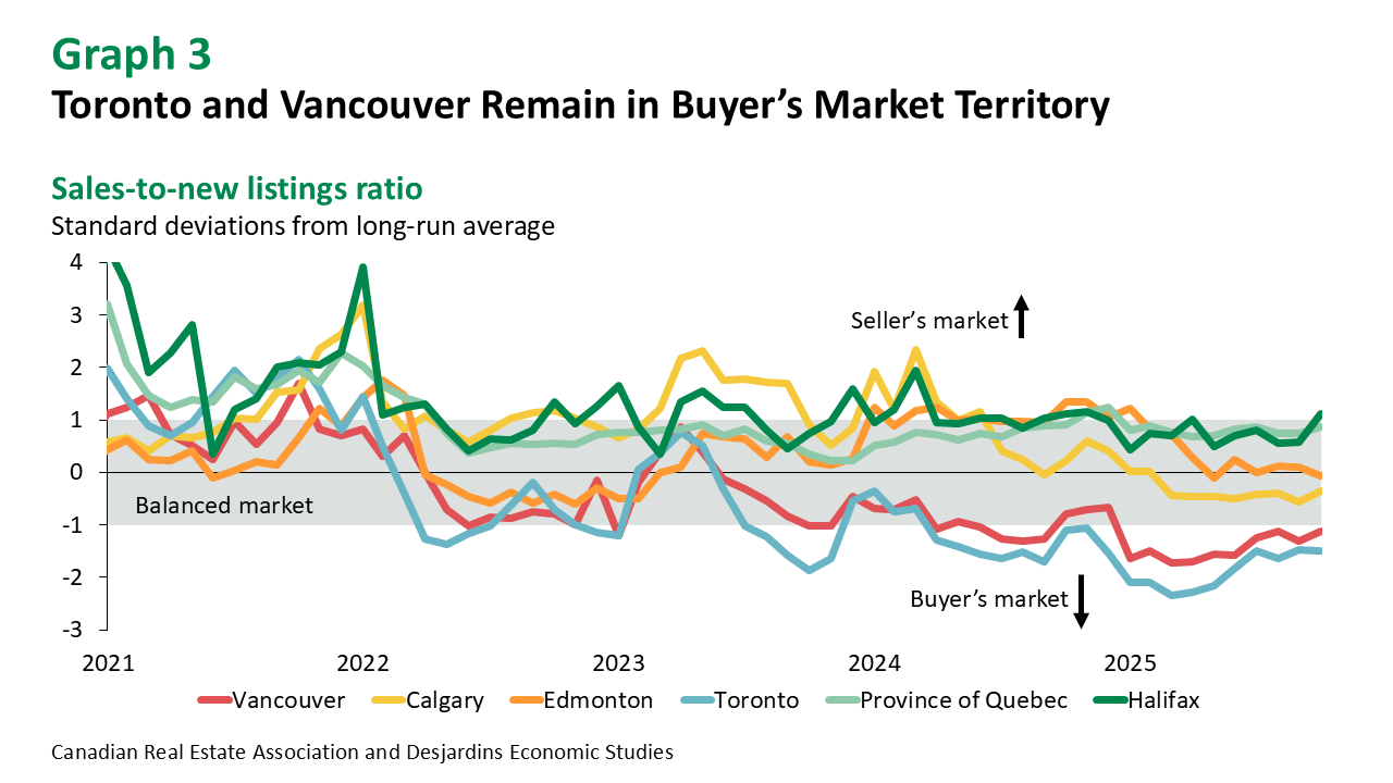 Nationally, new listings declined by 1.4% m/m and inventory held steady at 4.4 months in October—well above the post-2018 average of 3.7 months. The sales-to-new-listings ratio inched up from 51.0% to 52.2%, the highest level in 2025 albeit still balanced. Toronto and Vancouver continued in buyer’s market territory, while Halifax and the Province of Quebec edged towards a seller’s market (graph 3).