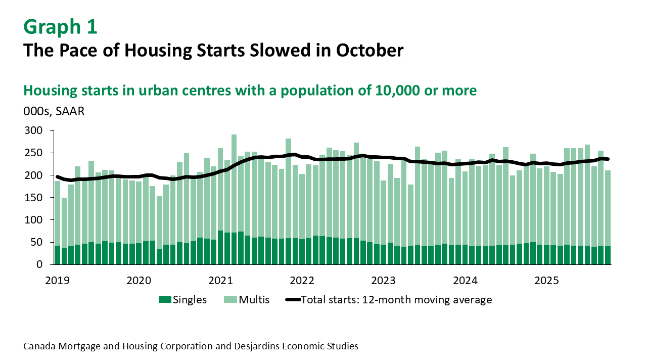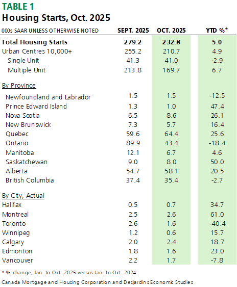 - The pace of housing starts in Canada slowed in October to 232.8k (saar) from 279k in September, pulling down the 6-month moving average to 269k. Table 1 summarizes key data points.