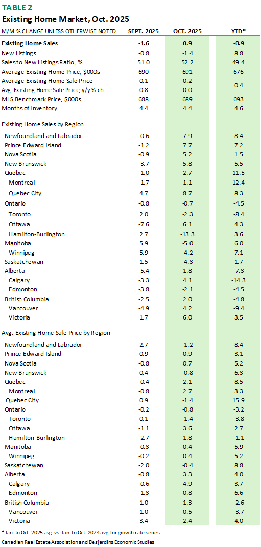 - Existing home sales in Canada edged up by 0.9% m/m in October. The average national sale price rose 0.2% m/m, while the benchmark price was essentially unchanged. Both remain well below their historic peaks reached in 2022. Table 2 summarizes key data points.