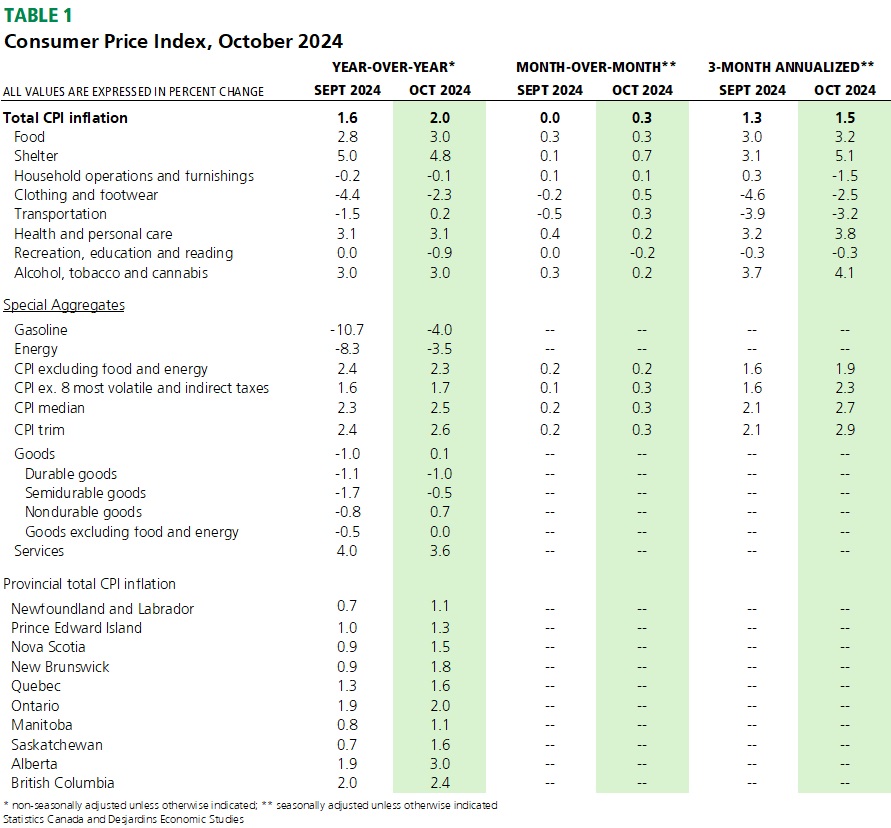 - Headline CPI rose 2.0% y/y in October, up four ticks from September and coming in slightly hotter than the expectations of economists (1.9%). Prices advanced 0.4% m/m but moved up by a somewhat more modest 0.3% after adjusting for seasonal effects. Table 1 summarizes the key data points.