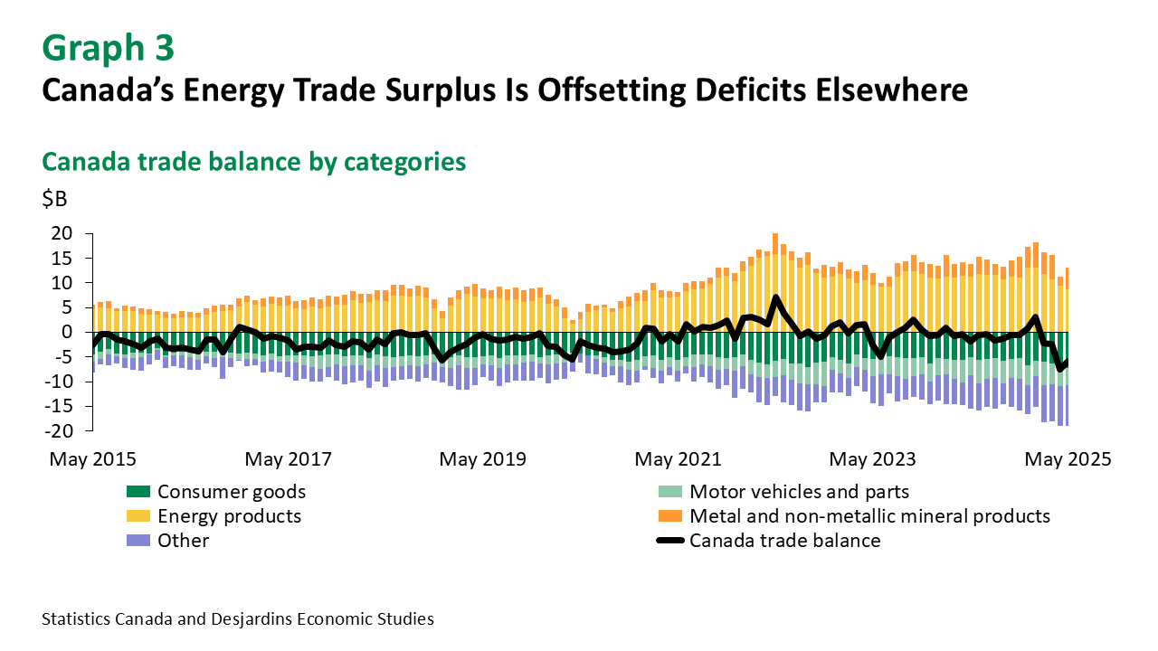 Seven out of 11 export categories experienced an increase in May, despite persistent trade tensions with Canada’s southern neighbour. Metal and non-metallic minerals posted the largest gains (15.1%), on the back of record high gold exports. Exports of consumer goods rose as well (2.6%), in part due to higher shipments of meat as well as prepared and packaged seafood products, much of it destined for Japan. In contrast, the fall in energy exports (-5.6%) can be primarily attributed to lower global oil prices, although Canada continues to have a substantial trade surplus in energy (graph 3).