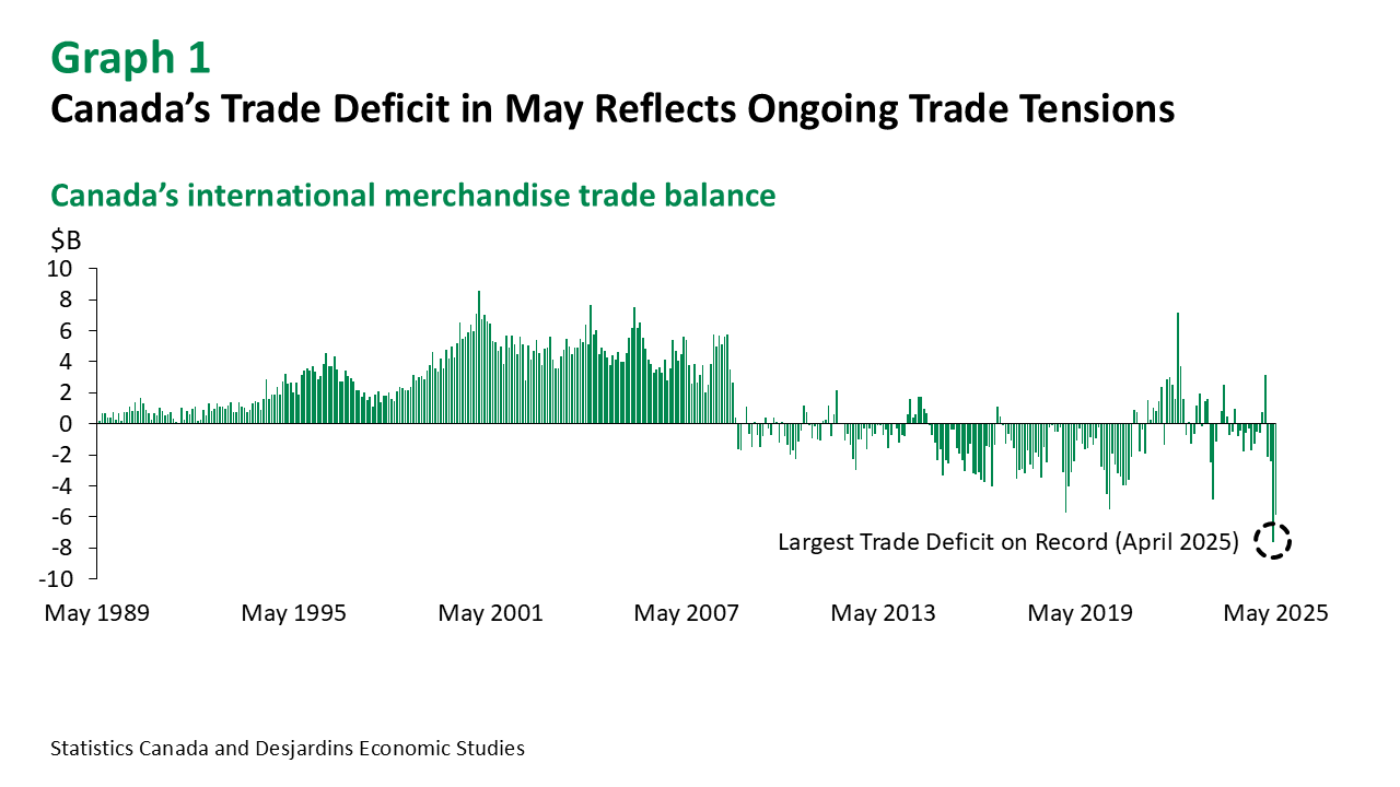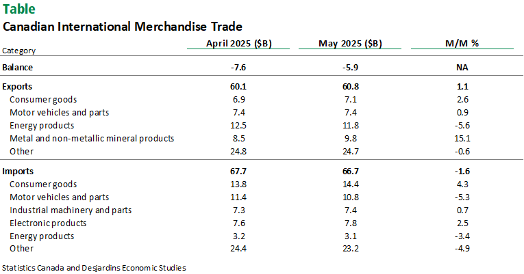 - Canada’s international merchandise trade deficit narrowed to $5.9B in May, after reaching a record low of -$7.6B in April (graph 1). This was slightly better than the consensus expectation of economic forecasters (-$6.0B). See table for more details.