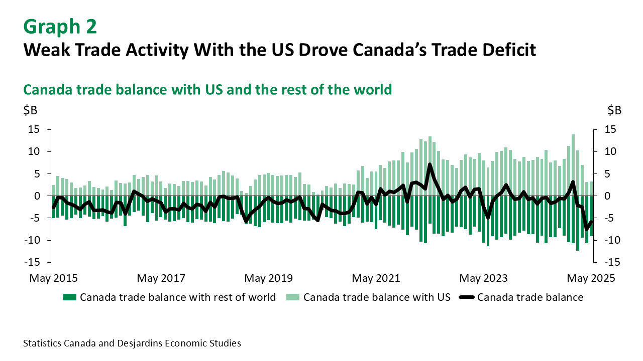 - Canada’s trade surplus with the US rose slightly from $3.1B to $3.2B in May (graph 2). However, Canada’s exports to the US dropped by 0.9% m/m, marking a fourth consecutive monthly decline. In addition, Canada’s share of exports to the US fell from a monthly average of 75.9% in 2024 to 68.3%—one of the lowest shares ever recorded. Meanwhile, Canada’s trade deficit with countries other than the United States narrowed from $10.7B to $9.1B in the month.
