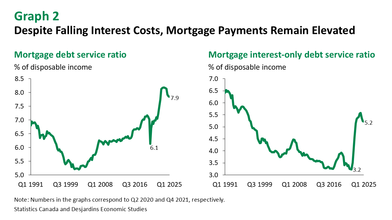 - The household debt service ratio—the share of disposable income directed toward debt payments—was unchanged at 14.4% in the first quarter. This isn’t far from the unprecedented peak of 15.1% reached in Q4 2023. Growth in disposable income helped to forestall a rise in the cost of debt servicing. The mortgage-only debt service ratio stood at 7.9% in the first quarter, slightly below the record high of 8.2% at the end of 2023 but still elevated (graph 2).