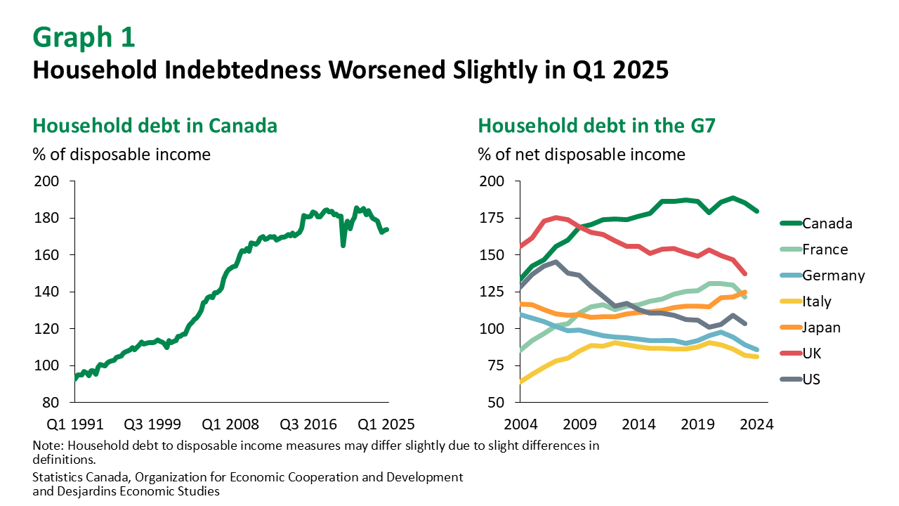 - Household credit market debt tallied $3.0T in Q1. As a proportion of household disposable income, it rose for a second straight quarter, reaching 173.9% from 173.5% in Q4 2024. Household indebtedness remained only slightly below the historic high of 185.7% reached in Q4 2021 (graph 1). Canadian households were the most indebted among G7 countries by a wide margin in 2024, and the Q1 2025 numbers don’t suggest that has changed.