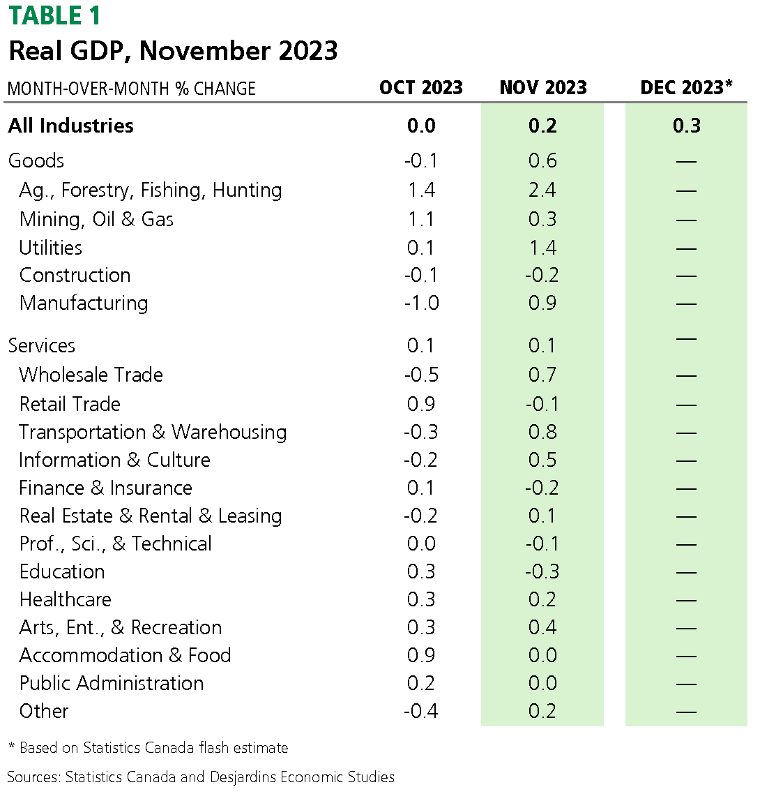 - Real GDP moved 0.2% higher in November, beating the consensus expectation of economists and Statistics Canada’s flash estimate (both +0.1%). Goods-producing sectors jumped 0.6%—the strongest growth since January 2023—while output in services-producing sectors edged up a more modest 0.1%. In all, 13 of 20 subsectors posted gains. See Table 1 for further details.