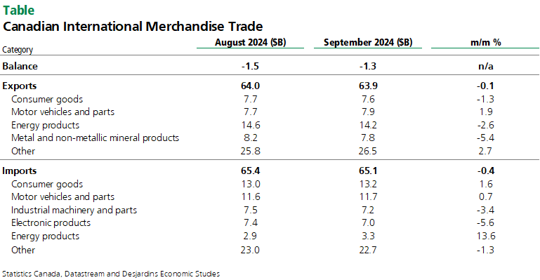 - Canada’s international merchandise trade balance is still in deficit but narrowed from -$1.5B in August to -$1.3B in September. This was close to the consensus expectation. See Table for more details.
