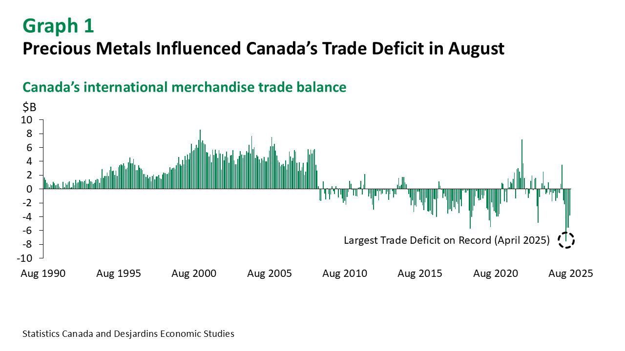 On the flip side of the trade balance, metal and non‑metallic product imports saw a sharp rise of 24.2% in August, largely thanks to higher gold imports. Consumer products also saw gains (2.3%), partly due to higher prices and pharmaceutical shipments from Switzerland and Belgium. In contrast to these gains, six of 11 product categories posted declines. Energy product imports fell the most (12.8%), mainly due to lower crude oil imports from the US. Note that past import data may be revised significantly due to the CBSA Assessment and Revenue Management (CARM) initiative.