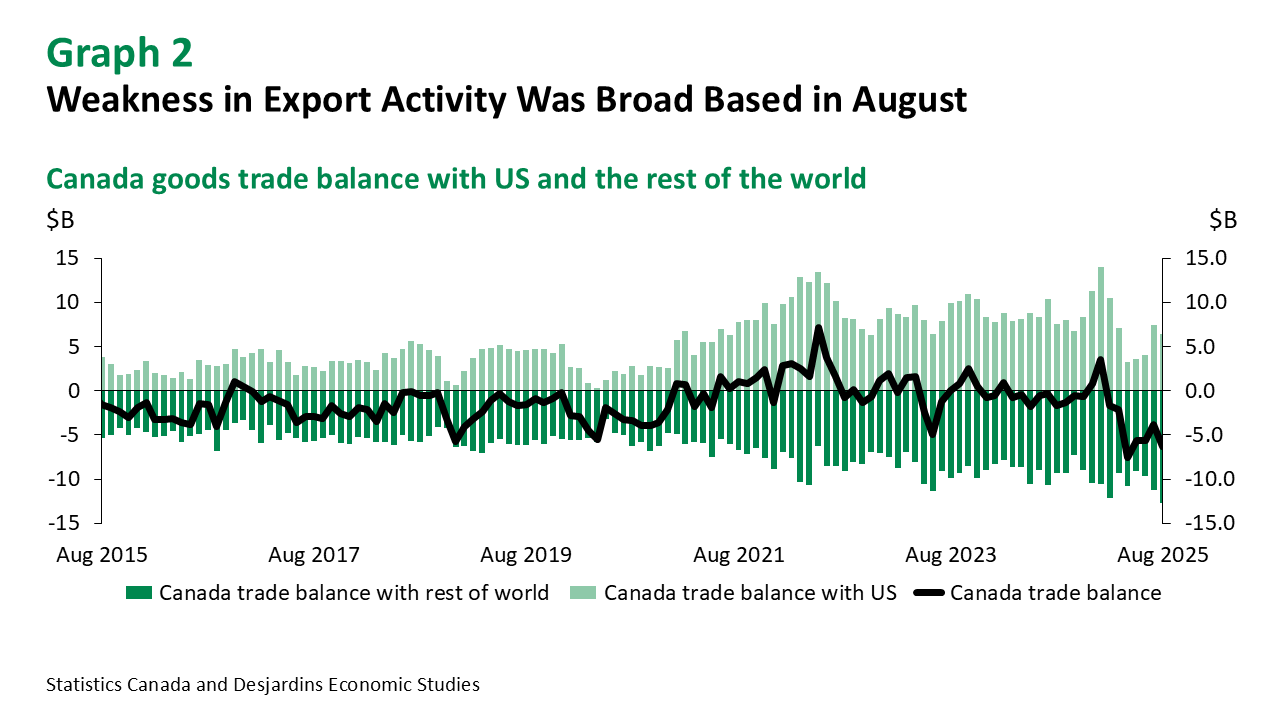 - Canada’s trade surplus with the US shrunk from $7.4B to $6.4B in August (graph 2). Meanwhile, the trade deficit with countries other than the United States widened from $11.2B to $12.8B in the month.