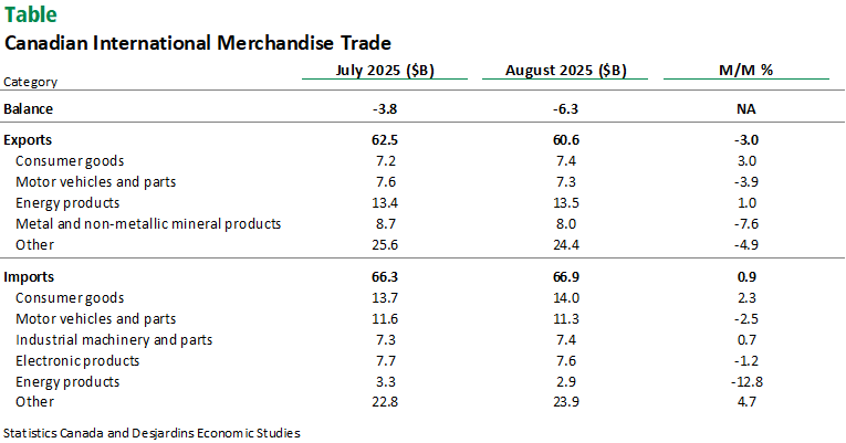 - Canada’s international merchandise trade deficit widened to $6.3B in August from a revised $3.8B in the prior month (graph 1). This was deeper into negative territory than the consensus expectation for a $5.6B deficit. See table for more details.