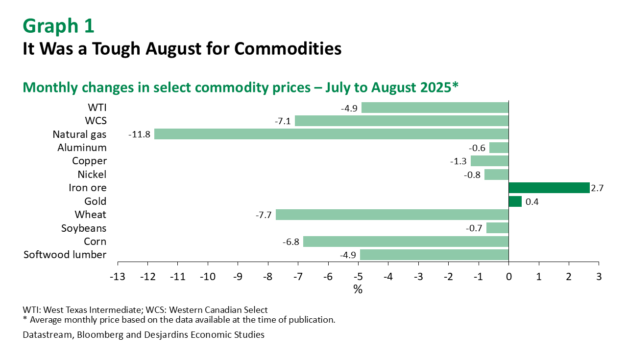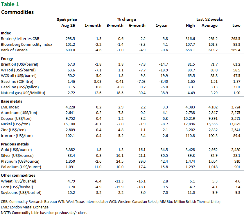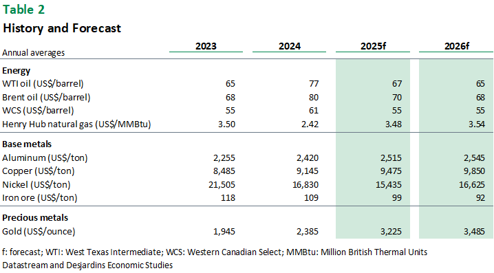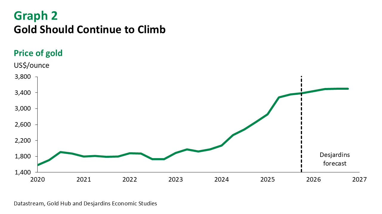 - Ongoing economic and geopolitical uncertainty should help gold end the year around US$3,400 per ounce. With interest rate cuts set to resume this fall and inflation expected to remain above the 2% target in the United States, gold should hover near the US$3,500 mark in 2026. Prices are also being supported by growing central bank gold reserves—part of a global move away from the dollar that shows no signs of letting up.