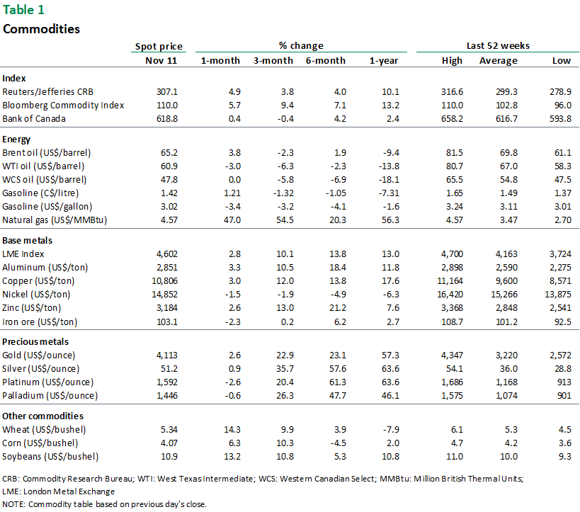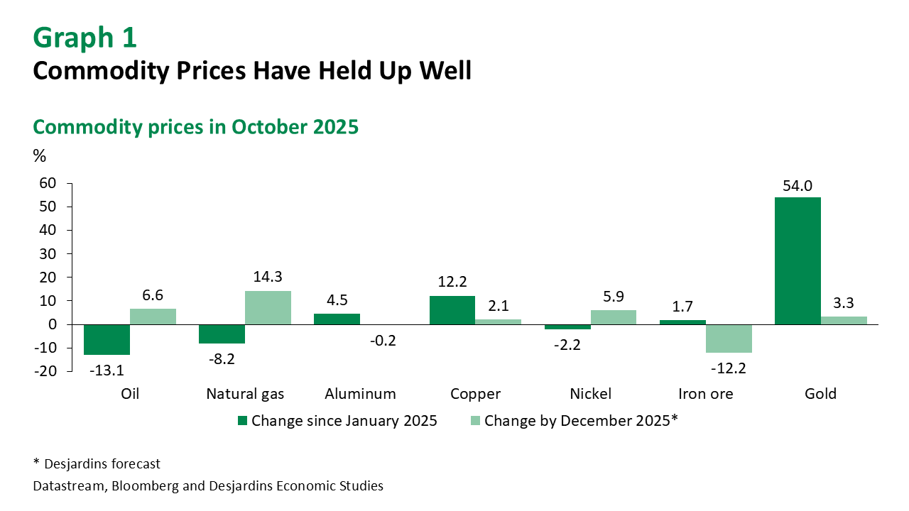 Despite the situation, commodity prices are holding up. Base metal prices are benefiting from surprisingly resilient global industrial production (graph 1). The price of gold skyrocketed before edging back down. We expect gold to continue to rise in the coming quarters. Oil prices have dipped recently, but they remain relatively stable as the market prepares for its biggest surplus since the pandemic. Agricultural commodity prices are fairly flat, while US trade policy is contributing to lumber price volatility.