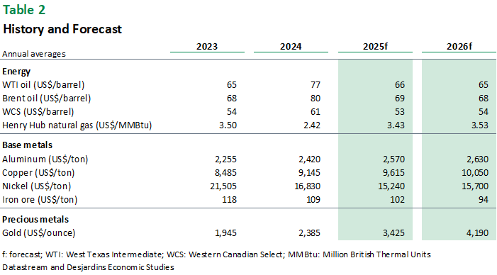 Despite low prices, nickel production has remained resilient, particularly in Indonesia, where government efforts to curb supply seem to have limited short-term impact. In Western countries, producers are struggling to cover costs and have been forced to scale back or shut down operations. In Canada, some producers have shifted to other ores like copper where feasible, but the situation remains challenging. The market surplus is not only expected to continue for a third consecutive year (into 2026), but it may also exceed initial projections. Accordingly, we’ve revised our 2026 nickel price forecast downward to US$16,000 per tonne. Medium-term prospects are more encouraging. The energy transition is ongoing, albeit at a slower pace, and is expected to lend support to prices.