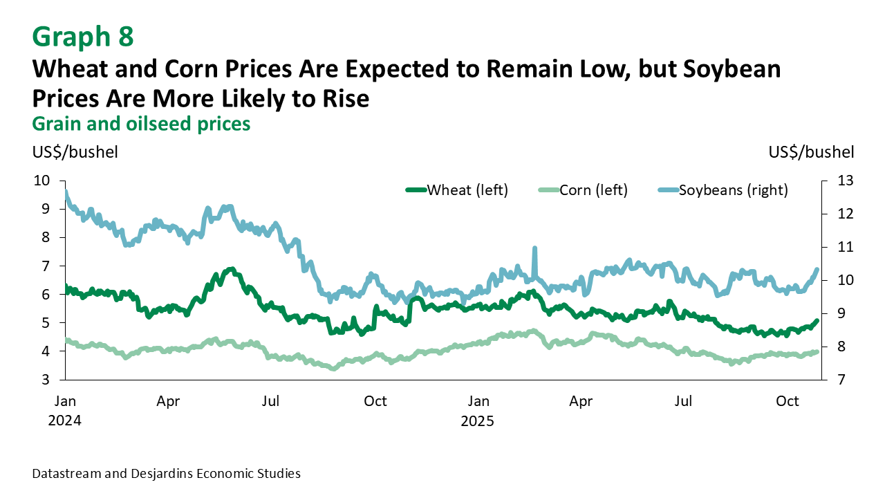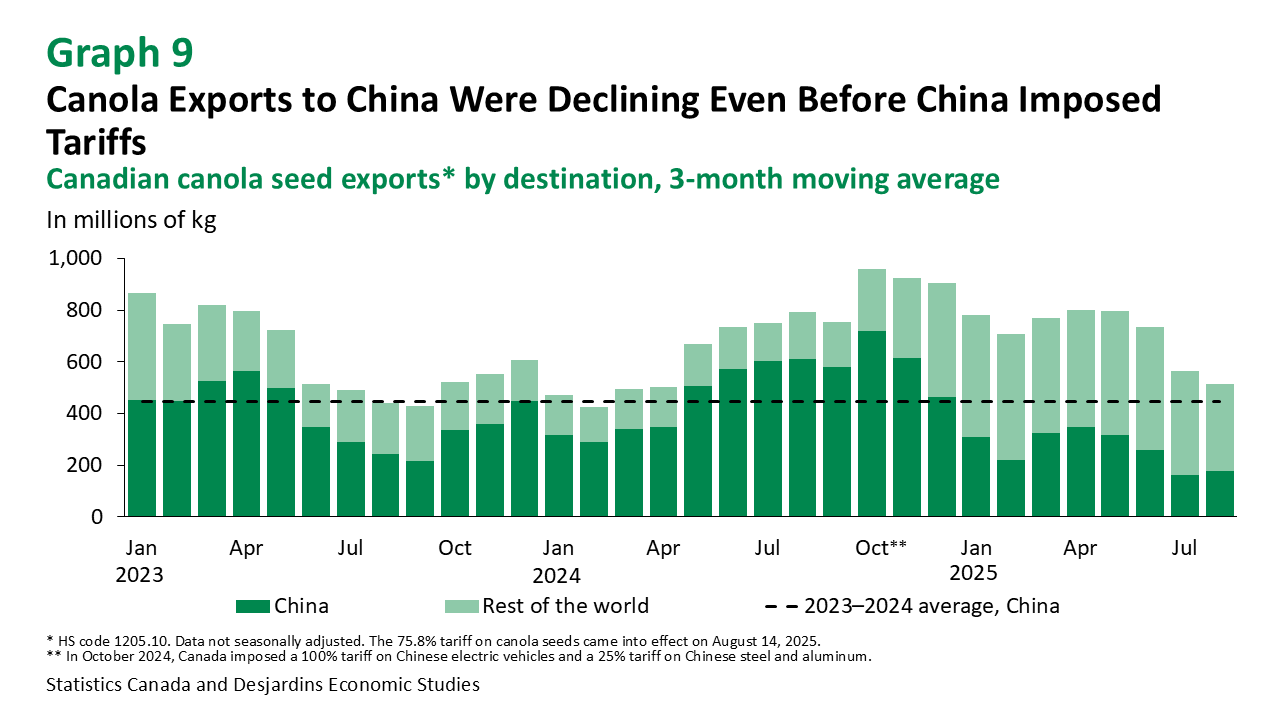 Agricultural prices remain relatively low and stable (graph 8). Corn prices are expected to hover around their current, relatively low, levels in the coming months, while soybean prices may see modest gains. China continues to shun US soybeans, with record Brazilian soybean exports stepping in to fill the gap. As for future wheat prices, we’ll be keeping a close eye on the winter harvest in the United States, Europe and around the Black Sea. For now, wheat prices are near five-year lows. Canadian canola exports to China declined due to trade tensions between the two countries, even before the 75.8% tariff took effect in August (graph 9). This has primarily impacted Saskatchewan, Alberta and Manitoba. Rising exports to Japan have only partially offset these losses.