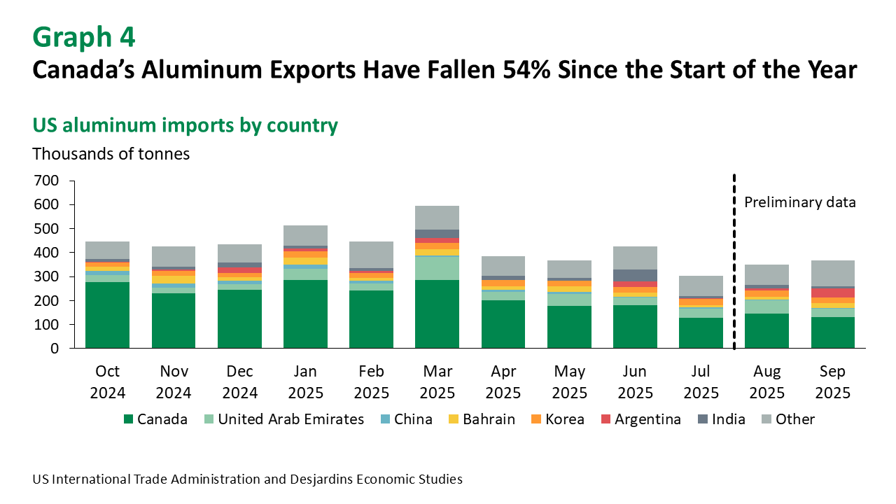 Disruptions to Icelandic production have caused prices to spike 6% since the beginning of September. However, this surge could be short-lived, as the global market remains in a slight surplus and the situation in Iceland should stabilize. That said, this disruption is not the only factor behind the recent price appreciation. Weakness in Canadian exports, which have fallen 54% since the start of the year (graph 4), has also helped to support prices as global supply continues to fragment. Quebec’s aluminum industry is looking to diversify its export markets, especially into Europe, but no market will be able to completely replace the United States. In 2024, the US imported 3.2 million tonnes of Canadian aluminum, representing 58% of their total imports. Canada’s recent entry into the European market this summer has offset only about 16% of volume losses to the United States.
