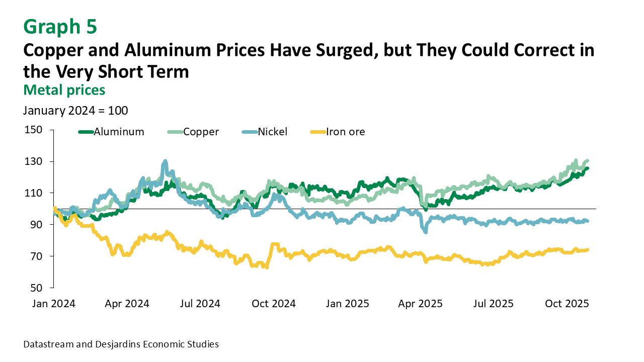 Although prices for aluminum, copper and iron ore have risen in recent weeks, their respective markets remain in surplus. As a result, current price levels are somewhat overvalued and all three are likely to soften in the very short term. That said, we continue to expect prices to edge back up in 2026, especially as advanced economies reindustrialize and militarize. Iron ore is an exception to this trend as growth in mining production is likely to push this market into a large surplus next year. We therefore expect the price of iron ore to fall in the coming quarters.