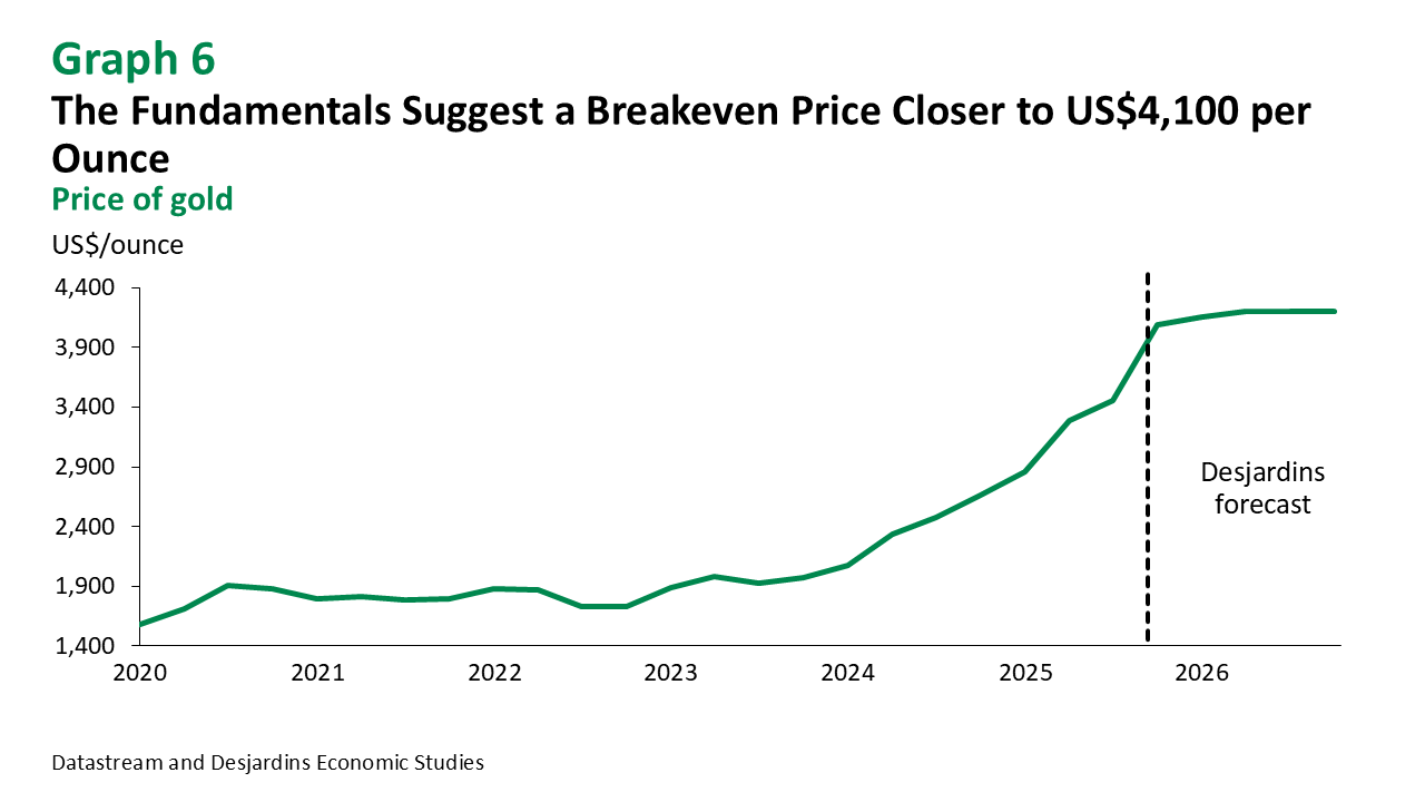 A perfect storm of factors is currently driving up gold prices: anticipated interest rate cuts, mounting inflationary pressures, a weakening greenback, US federal government gridlock, concerns that certain financial securities may be overvalued, and global geopolitical instability. All of these factors are supporting gold’s upward trajectory, which is expected to continue in the coming quarters. That said, the fundamentals point to a breakeven price of around US$4,100 per ounce, which means the recent correction is no surprise. Volatility and speculation remain high on the gold market, potentially leading to significant price swings in either direction. For 2026, we anticipate a more moderate increase, with gold prices projected to end the year near US$4,200 per ounce.