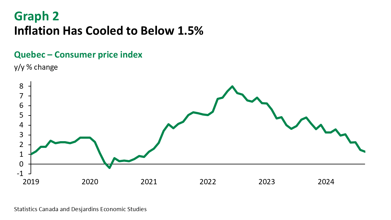 Cooling inflation is also helping. In Quebec, it slowed convincingly to 1.3% in September, easing households' concerns about where consumer prices are headed (graph 2).