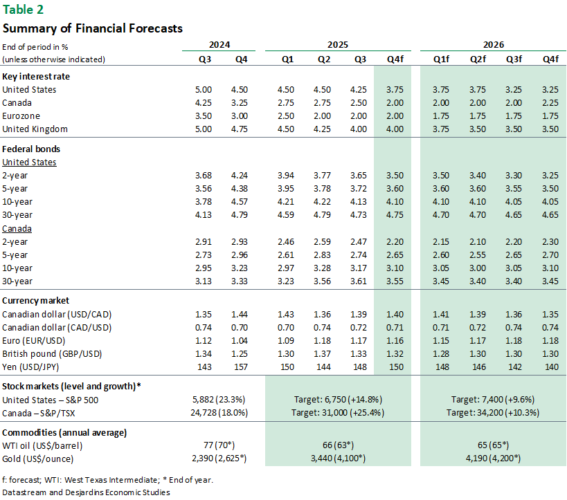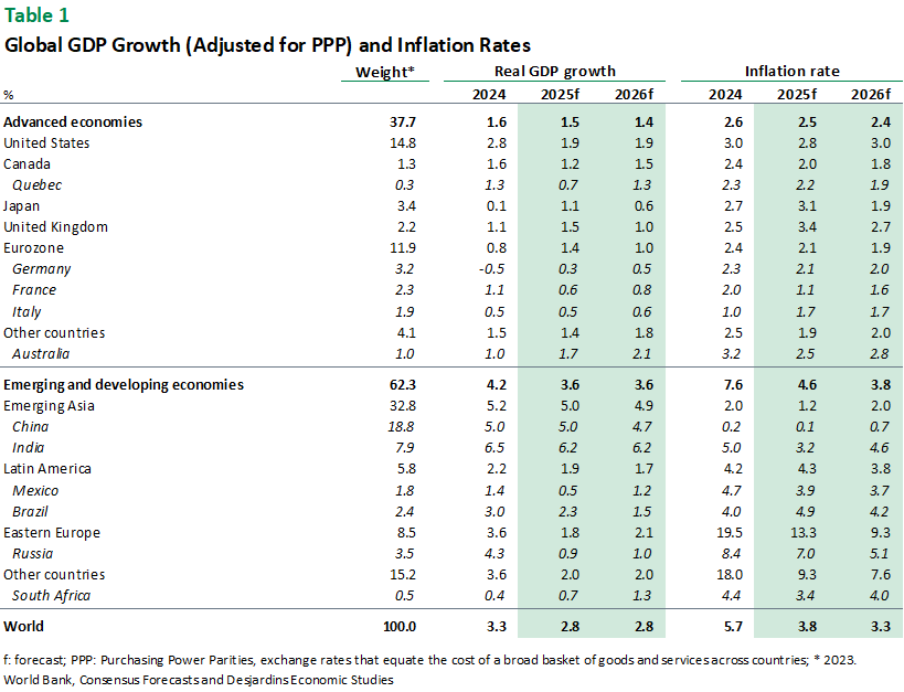 - The global economy is still showing resilience, but that resilience is being put to the test. The United States has threatened further protectionist measures, primarily against China, and new tariffs on US heavy‑duty vehicle imports are expected to take effect on November 1. That said, economic growth seems to be holding steady in Europe, and PMI indexes have been fairly solid lately. China’s exports contributed to growth in the third quarter, but this was offset by a renewed slowdown in domestic demand. All things considered, we expect global real GDP to rise by 2.8% in 2025 and in 2026.