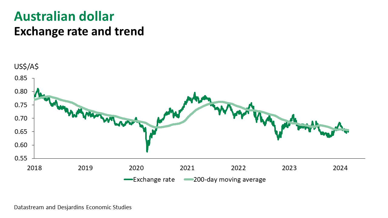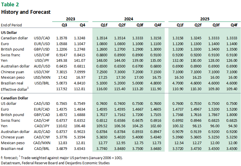 - We expect the Canadian dollar to continue trading around CAN$1.35/US$ (US$0.74) in the coming months. It should bounce back a little once the global economy picks up in the second half of the year and in 2025 and as commodity prices start rising.