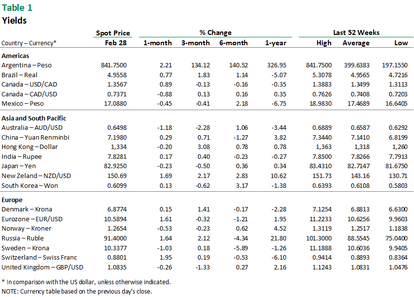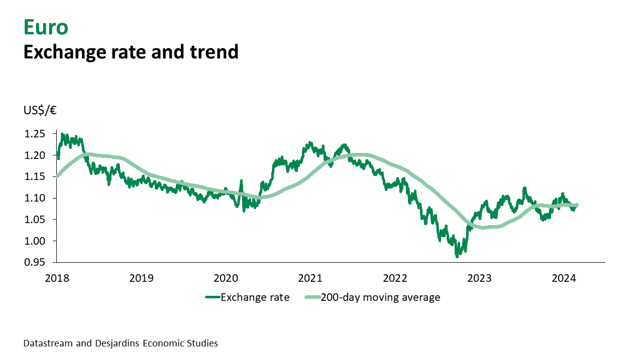 - In Europe, a few countries have officially fallen into a recession after posting at least two consecutive quarters of negative real GDP growth. The United Kingdom is among those now grappling with a recession. At the same time, its inflation rate continues to ease. The pound fell below US$1.26 a few times in February. The eurozone economy remains fragile, which is helping bring down inflation. The annualized 3-month change in core inflation, which strips out food and energy, stands at 2%. The common currency hovered around US$1.08 in February, dipping to a low of US$1.07 mid-month after US inflation figures were released.