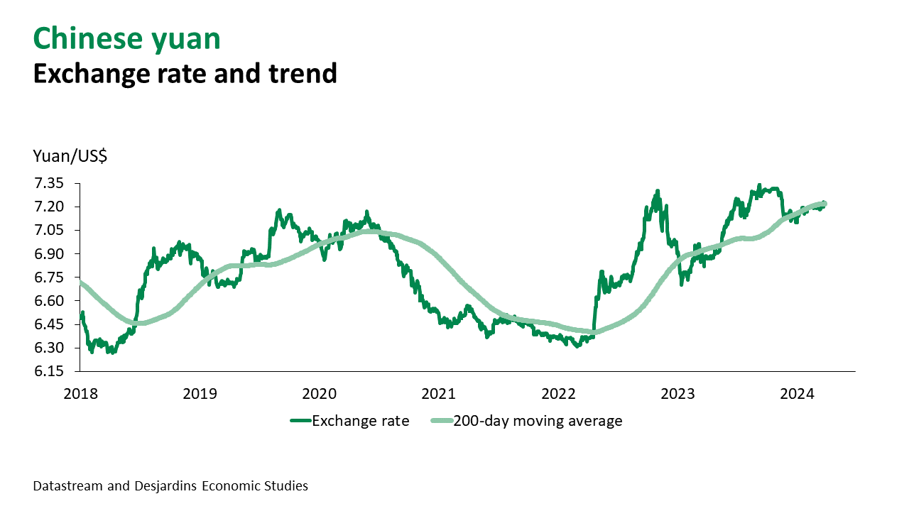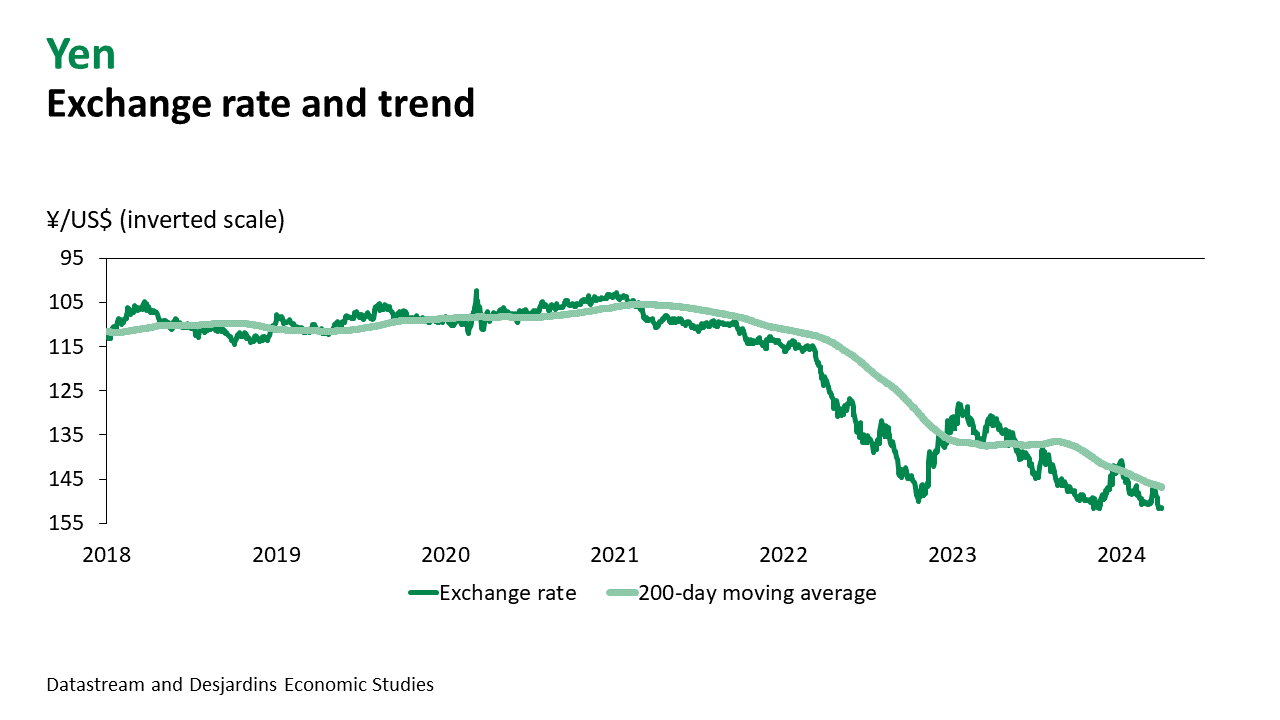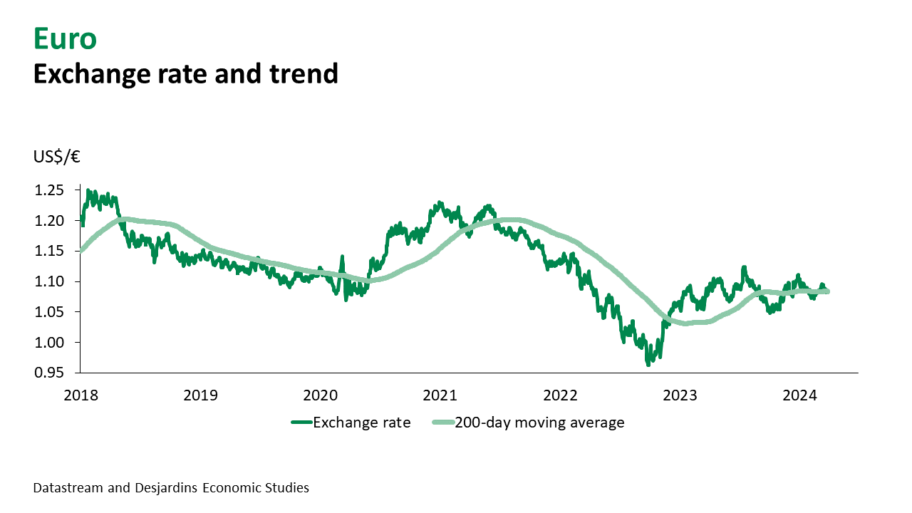 - The pound didn’t do much better than the euro in March and is currently trading at around US$1.26. Even though inflation is running higher in the United Kingdom, the Bank of England is encouraged by recent easing. At its most recent Monetary Policy Committee meeting, no members voted to increase the policy rate, in contrast with two at the previous meeting.