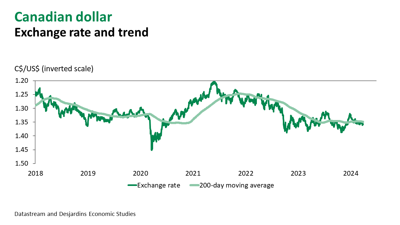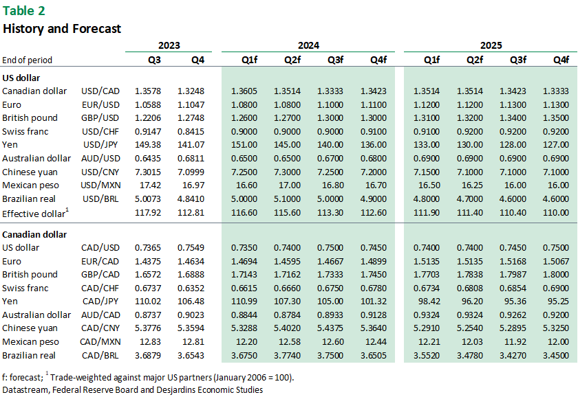 - The potential for appreciation seems lower for the Canadian dollar. Inflation has already come down considerably in Canada, and we still believe the Bank of Canada will make several interest rate cuts starting in June. Interest rate spreads will probably hold the loonie back. Commodity prices are expected to go up, but not enough to sustainably push the Canadian exchange rate below CAN$1.33/US$ this year or next.