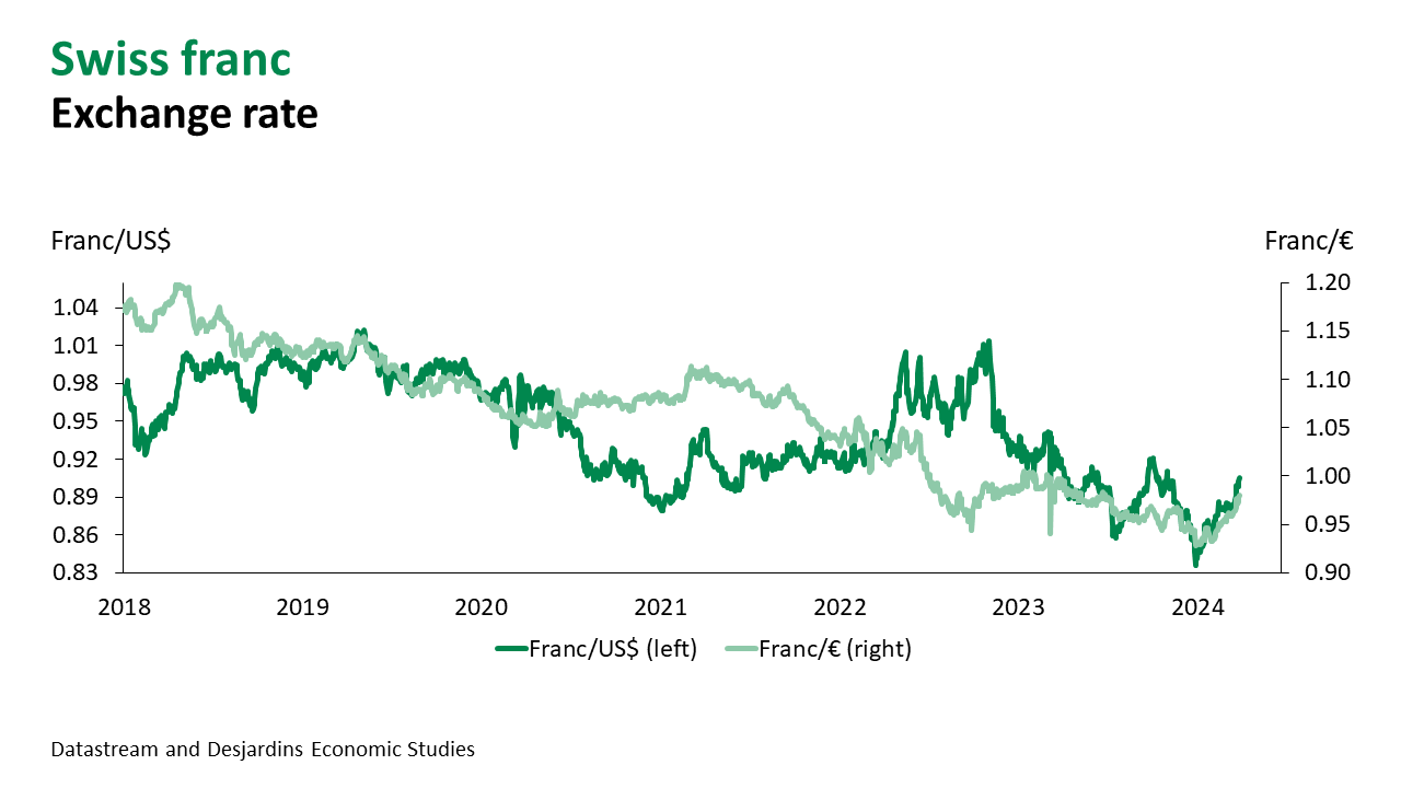 - The Swiss franc depreciated again after the Swiss National Bank announced a first interest rate cut in March. The decision was justified, however, as the country’s inflation rate has been below 2% for a while. The franc is now trading at over 0.90 francs/US$.