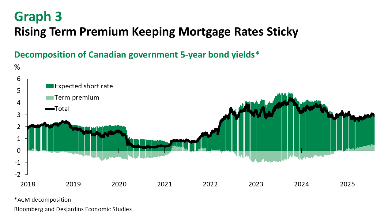 There is still scope for mortgage rates to fall across the curve in the second half of the year, but we’re penciling in less of a decline in 5‑year posted mortgage rates relative to 1‑ and 3‑year tenors. Part of this reflects ongoing pressures on longer‑term yields which, have resulted in rising term premiums. This trend is evident in the 5‑year sector where a sizeable share of mortgages are issued (Graph 3).