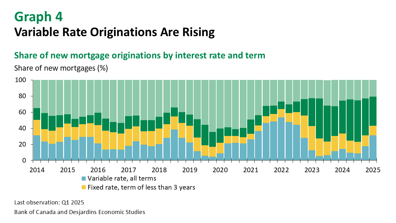 While 1‑year and 3‑year mortgage rates may see more relief, they tend to be higher than for the 5‑year sector, limiting their appeal. By contrast, variable mortgage rates have turned more competitive, and originations have increased in that sector as a result (Graph 4). Variable rates should continue to move lower, in tandem with the policy rate, likely eliciting some take-up in a context of still‑stretched affordability.