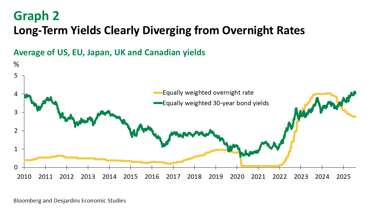 The average 30‑year yield on major market sovereign bonds has been moving higher, while the average overnight rate across jurisdictions has fallen (Graph 2). A myriad of factors continue to put upward pressure on long‑term bond yields, not least of which are looming concerns around the fiscal outlooks for many countries. While we still believe that 10- and 30-year yields are likely to be lower one year from now, curves should continue to steepen as a higher term premium dampens the effect of falling short rates on the long end. Sharpe ratios (i.e. the expected returns relative to the expected volatility of these returns) on long‑term debt are likely to be lower than during previous cutting cycles due to these dynamics, making it riskier to hold duration.