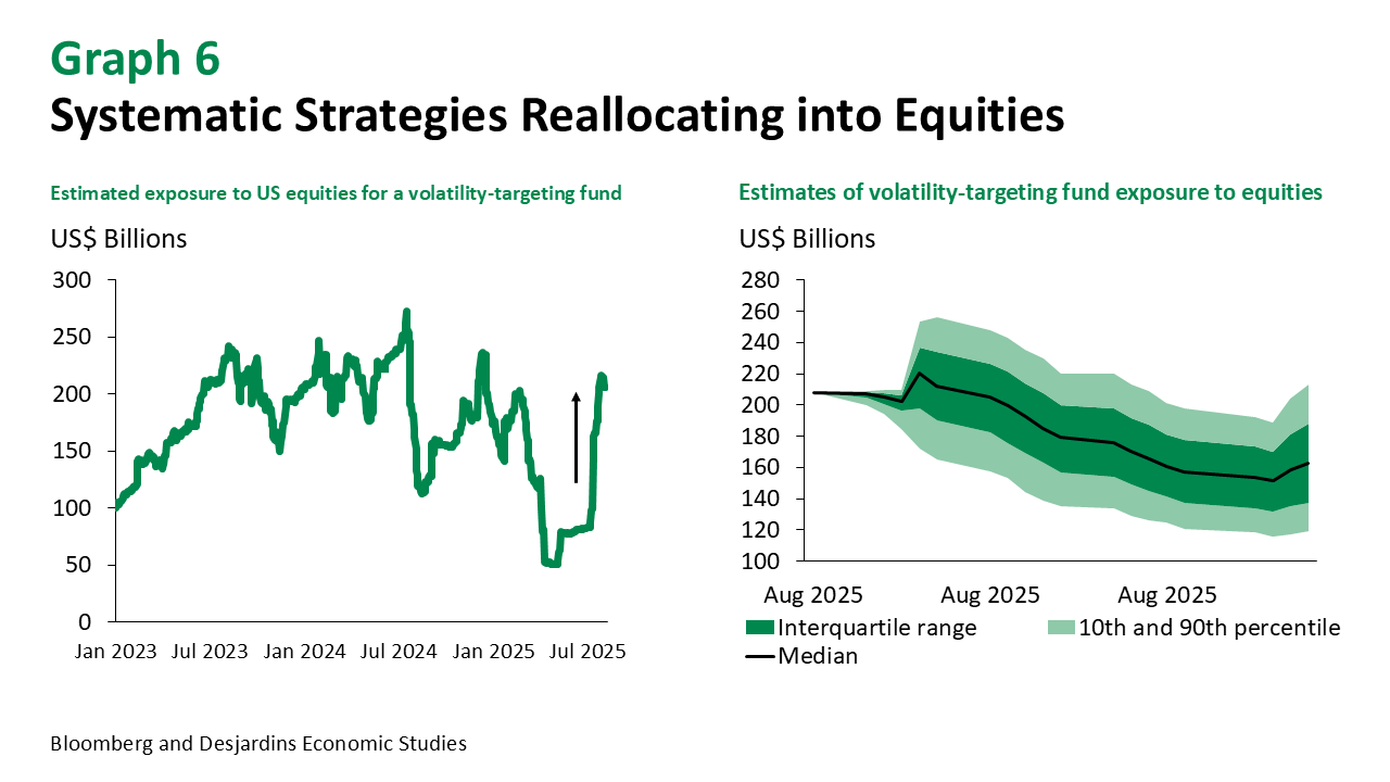 Risk assets looked through any adverse headlines relating to US central bank independence and have remained stable. The S&P 500 posted 23 consecutive days without a 1% move, the largest run since last September. That’s helped improve liquidity with market depth, as measured by order book depth on S&P 500 futures, suggesting some of the best conditions seen this year. That said, part of this stability has also been technical. Volatility‑targeting funds, most popular among variable annuity product portfolio managers, have been strong buyers of equities throughout July (Graph 6). Trend‑following Commodity Trading Advisors (CTAs) have also been reallocating back into equities, supporting the price action.
