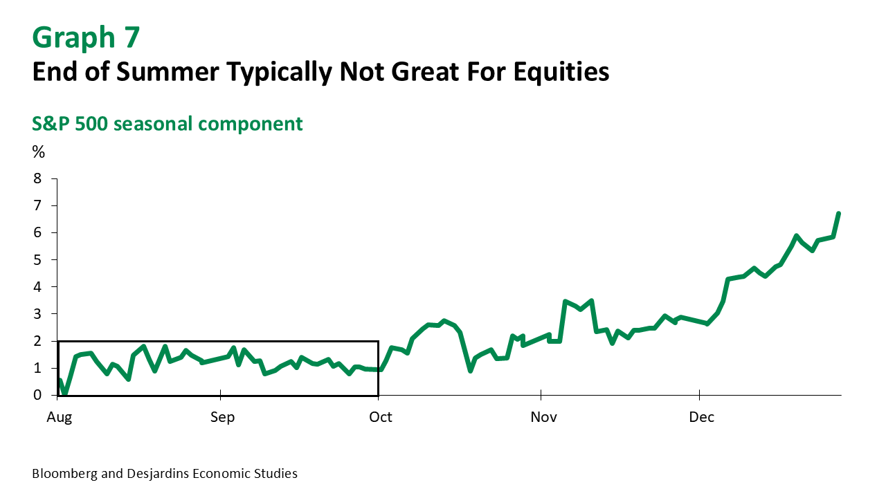 Seasonally, August through to September tend to be uninspiring months for equities (Graph 7). Mutual funds tend to see large redemptions throughout August as well. This soft patch is coming at a time when economic data is starting to show more signs of weakness following the tariff barrage earlier in the year.