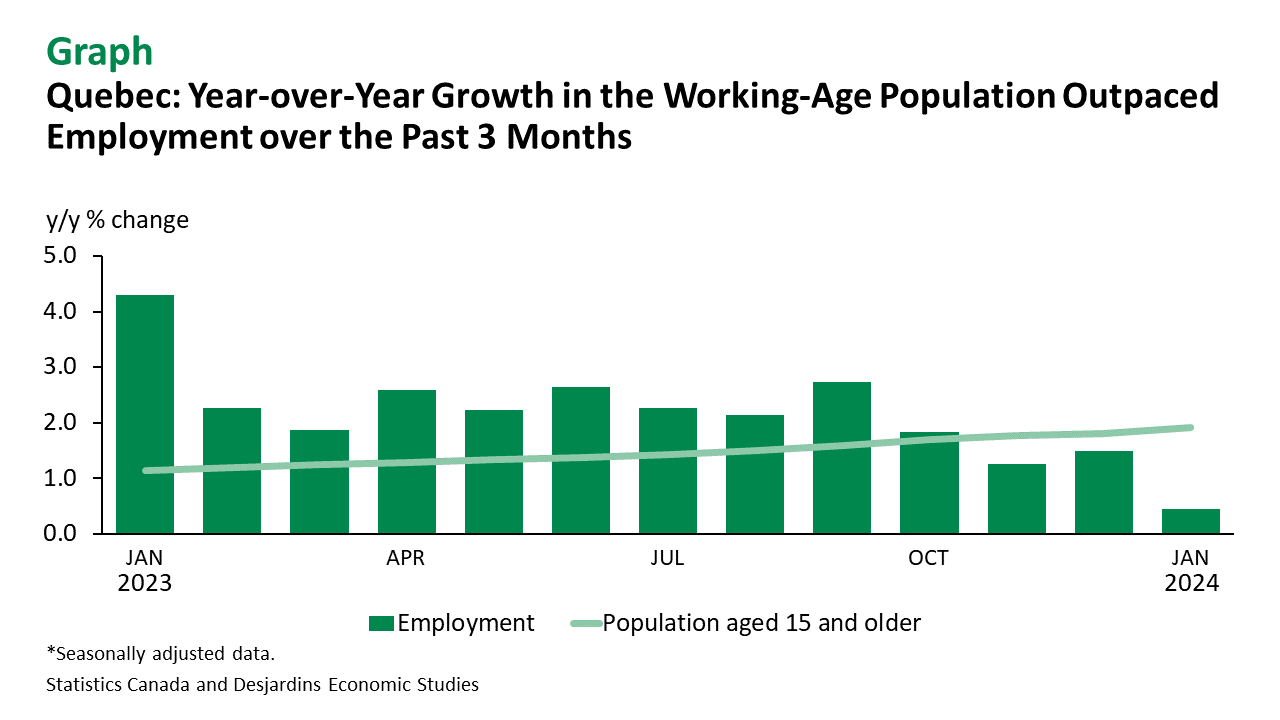 - Hours worked continued to flag (-0.6% compared to January 2023), even though teachers went back to work in January. Average hourly wage growth slid once more, from 3.6% in December to 3.3% in January on a year-over-year basis.