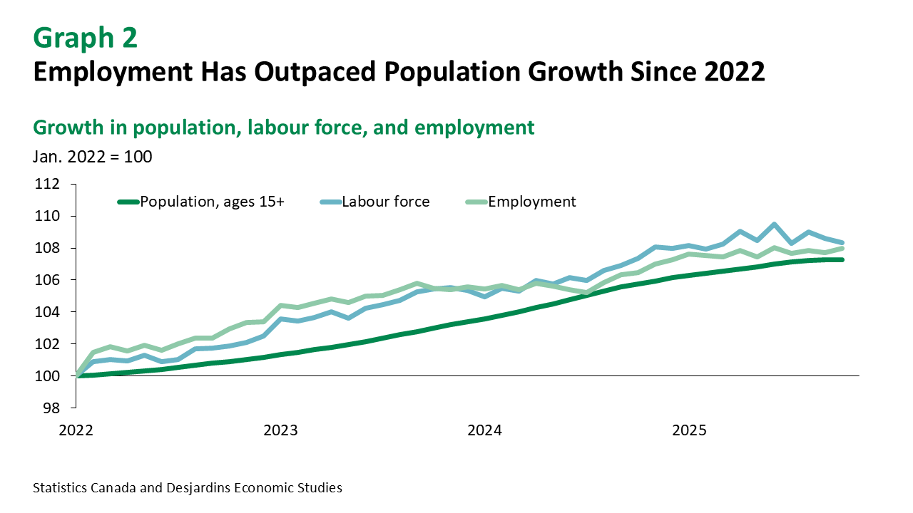 Early fourth-quarter data point to some momentum in Quebec. While full-time employment remains a weak spot, labour market resilience is evident across regions and sectors. Wage growth has stayed strong, reaching 4.3% year-over-year—the fastest pace in twelve months. This momentum may be linked to the stagnation in the population aged 15 and over (+400 in October), a labour force that has remained flat since the beginning of the year, and employment growth that continues to outpace demographic gains since 2022 (graph 2). In the current climate of uncertainty, this suggests that labour supply constraints are a greater drag on economic performance than weak demand—at least outside Quebec’s more urban regions.
