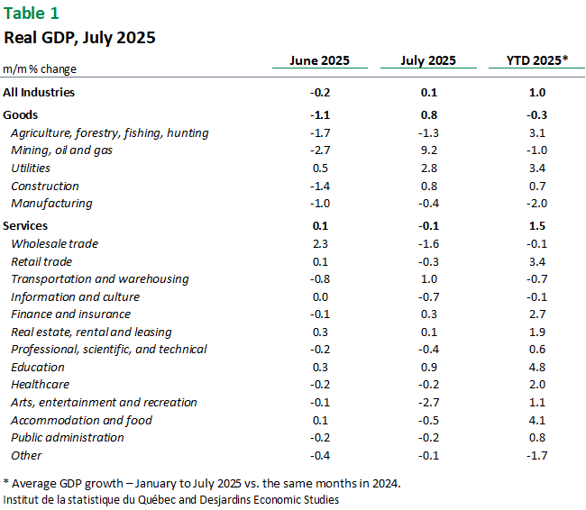 - Quebec’s real GDP posted its first gain since March, edging up 0.1% in July—a rebound weaker than that observed in Canada External link. (+0.2%). Cumulatively, GDP is up 1.0% compared to the first seven months of 2024.