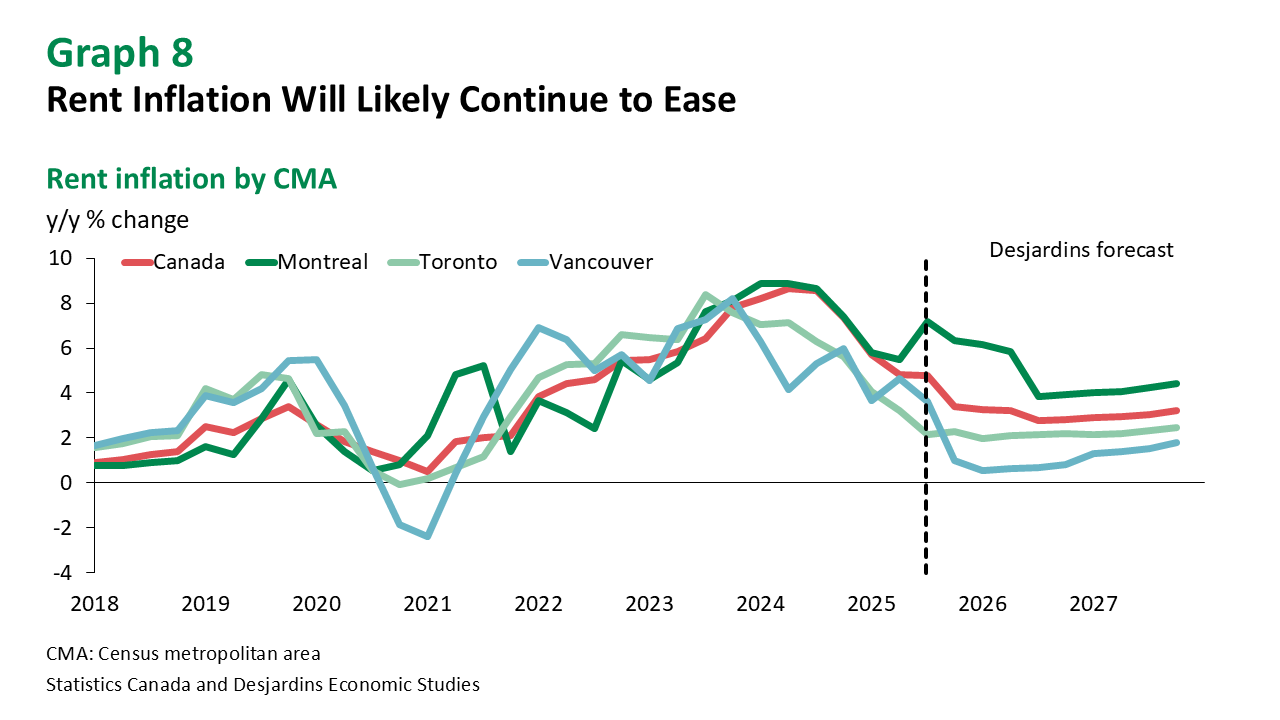 As a result, the Quebec rental market will likely become more balanced, easing rent inflation. Slower population growth and expanding rental supply have already started moderating growth in average asking rents, especially in Montreal. This is welcome news, as the gap between rents and income has widened over the past year (graph 7). Rent inflation is expected to continue to slow External link. through mid‑2026 before gradually accelerating as demand rebounds and new housing supply shrinks due to cost and regulatory challenges. Rent control measures taken by the Tribunal administratif du logement (TAL) will also affect the pace of rent rises across the province and partly explain why slightly higher increases are expected in Montreal (graph 8). Although the TAL has yet to issue its recommended rent adjustment for 2026, its new formula should result in smaller increases going forward.