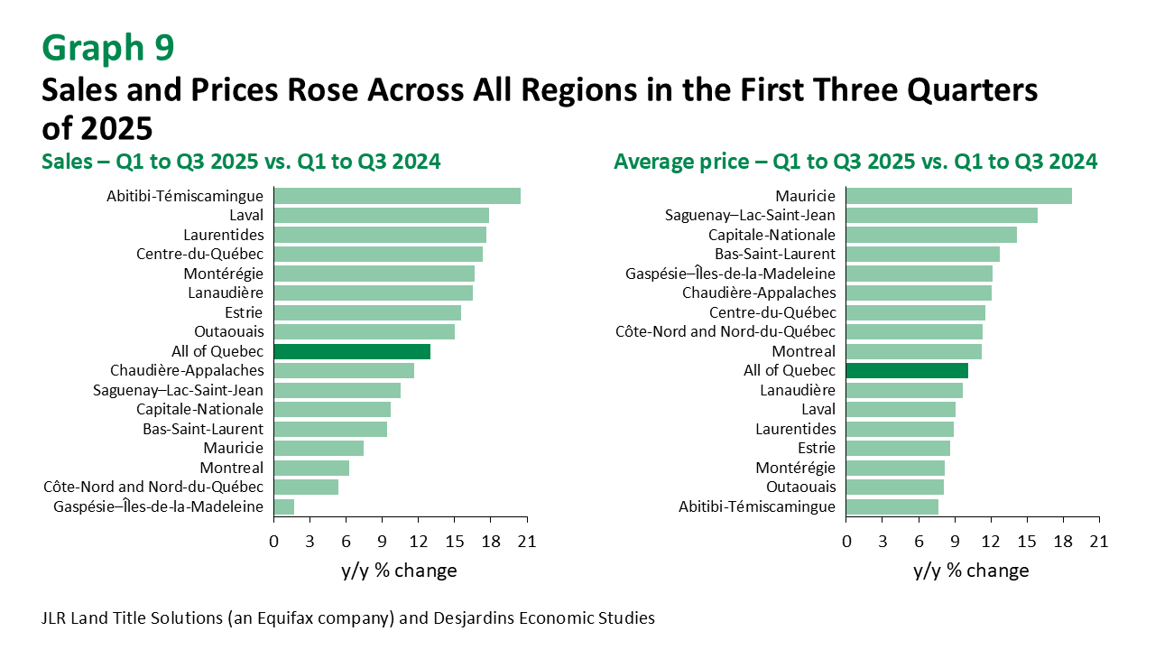 Sales and prices are climbing across Quebec. Inventory is gradually improving in most regions, but price increases are sharper in places where the market has been slower to rebalance, such as Mauricie, Capitale‑Nationale or Saguenay–Lac‑Saint‑Jean (graph 9).