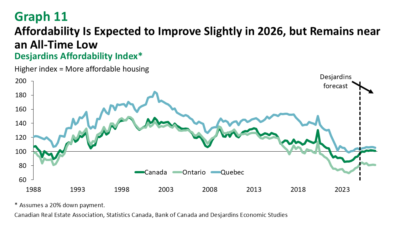 Demand was expected to slow in early 2025 due to weaker consumer confidence resulting from the trade dispute with the United States. But over the past year, prospective buyers in Quebec seemed less concerned than elsewhere in the country, as home sales held up. Transactions continue to rise, and while new listings are also up, strong demand is still pushing prices higher. Although mortgage rates have declined, affordability remains weak.