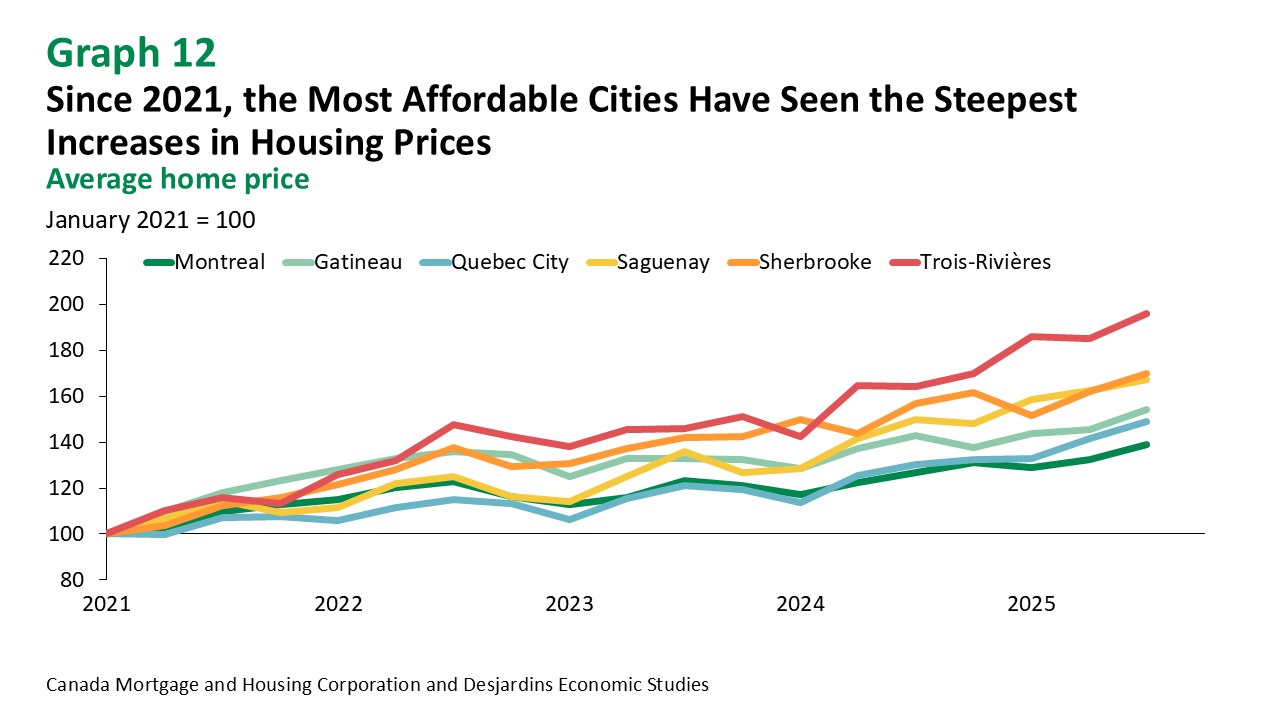 Strong demand has driven especially steep price increases in Quebec’s most affordable cities (graph 12). Between the third quarters of 2021 and 2025, average home prices in the Trois‑Rivières census metropolitan area (CMA) jumped about 70%, compared to 26% in the Montréal CMA. This deterioration in affordability could curb demand in the coming years. The solution is to boost housing supply, focusing on segments that best meet market needs.